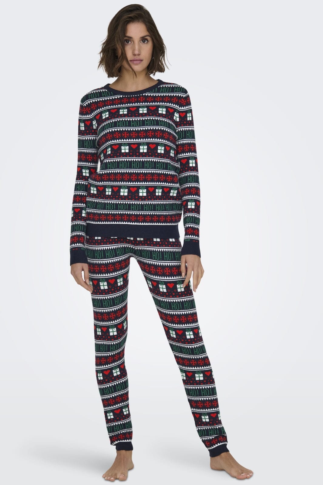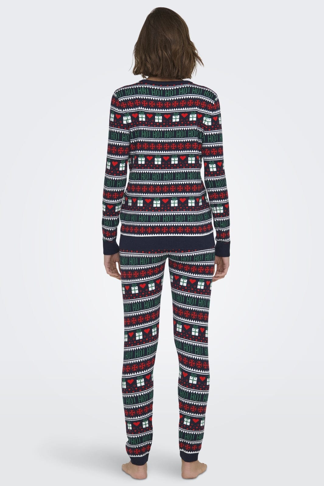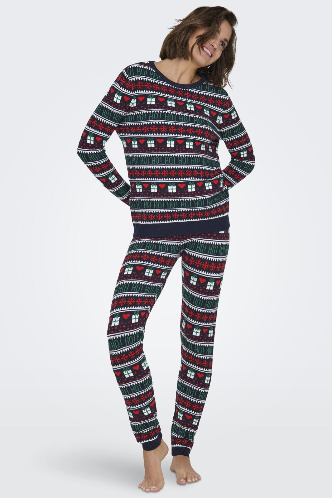 Sweter świąteczny od Only w ciemnoniebieskim kolorze z tradycyjnym wzorem bożonarodzeniowym. Sweter ma czerwone serca, zielone prezenty i białe płatki śniegu w paskowanym wzorze, który biegnie dookoła.