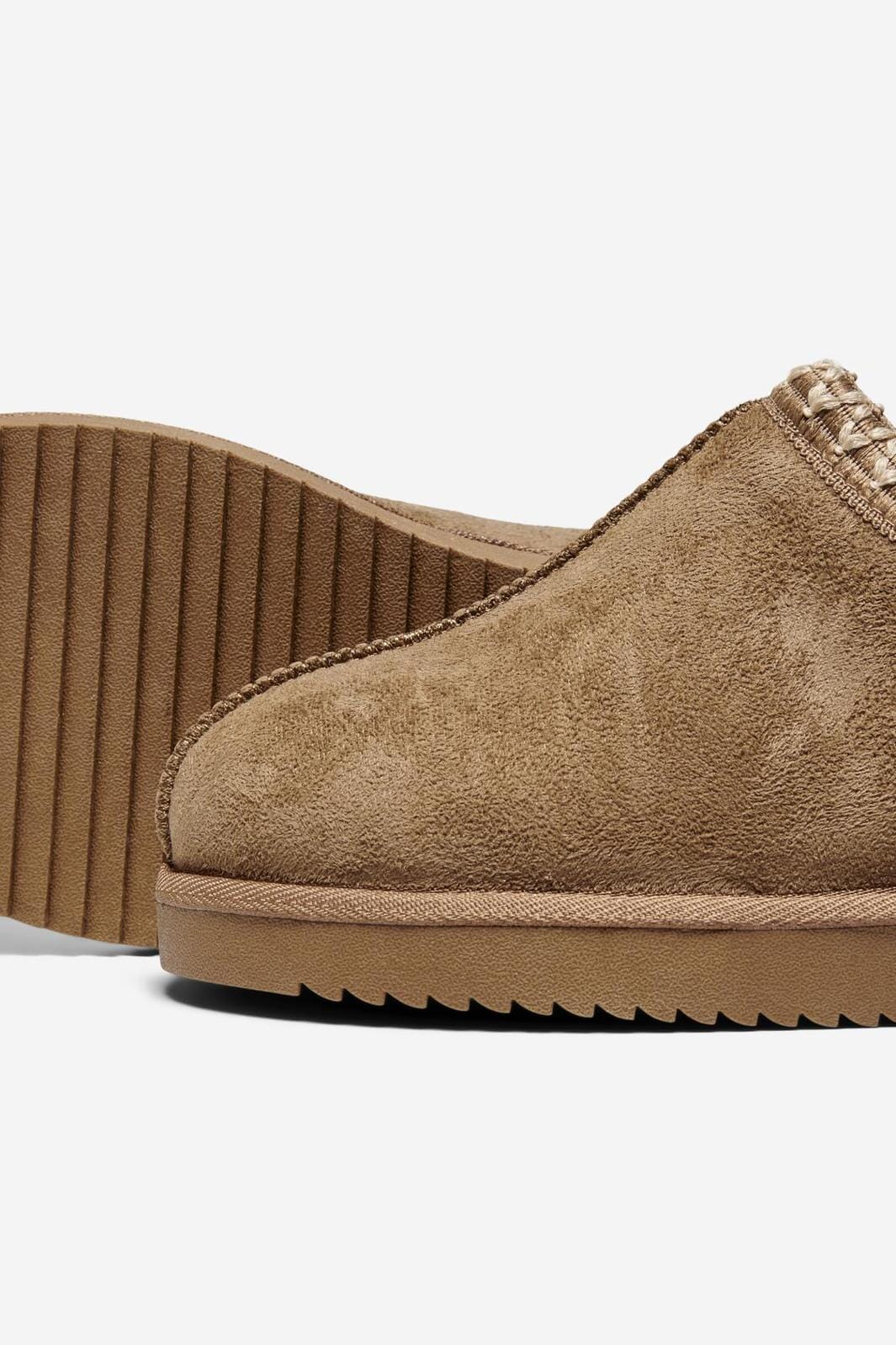 Kapcie od Only w kolorze koniaku z syntetycznego zamszu. Miękki but ma ciepłą podszewkę z teddy i dekoracyjne szwy wzdłuż krawędzi.