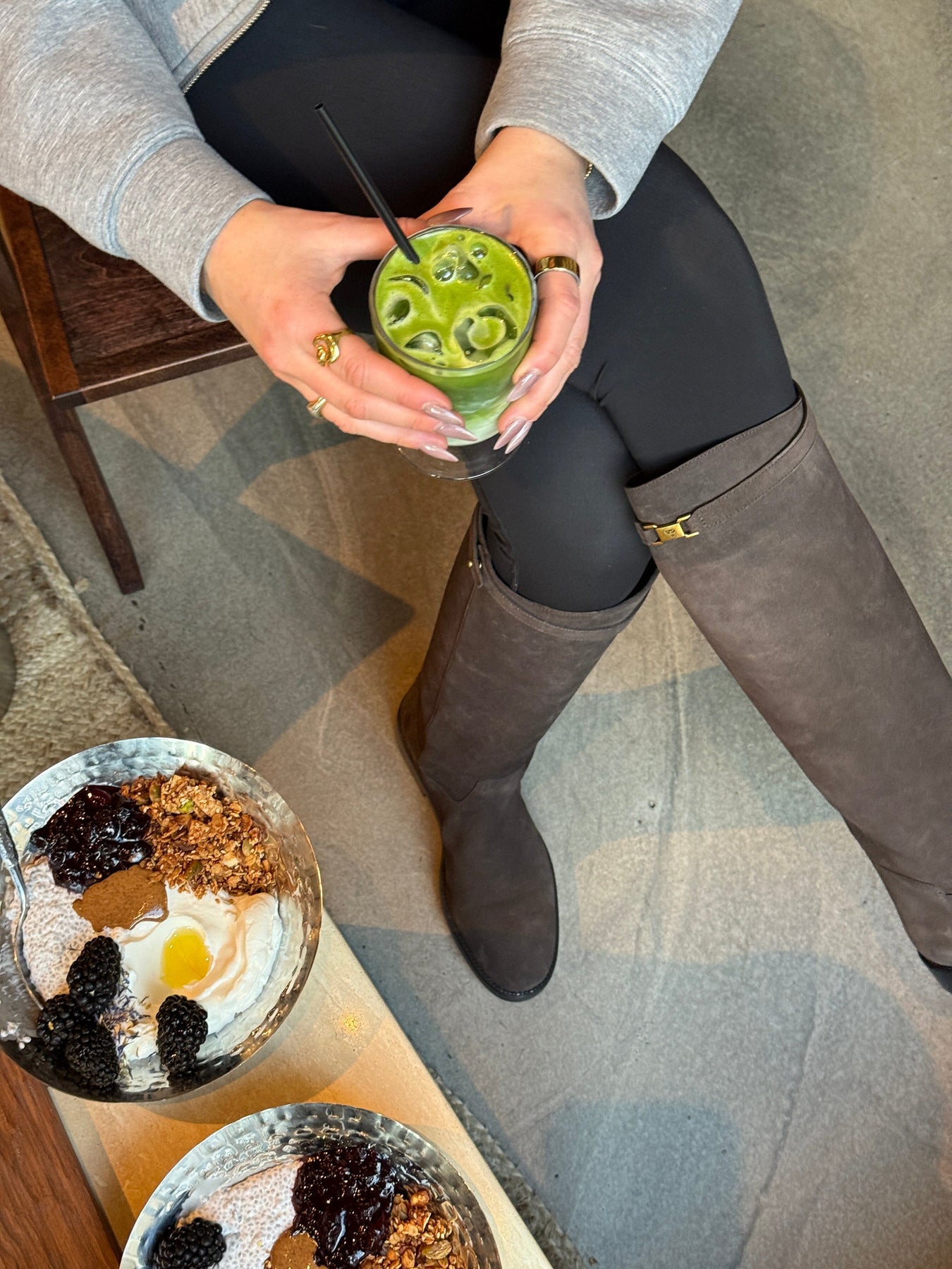 Kozaki do kolan od Phenumb Copenhagen, wykonane z zamszu w ciemnobrązowym odcieniu. Kozaki mają płaską czarną podeszwę i małą złotą klamrę u góry.