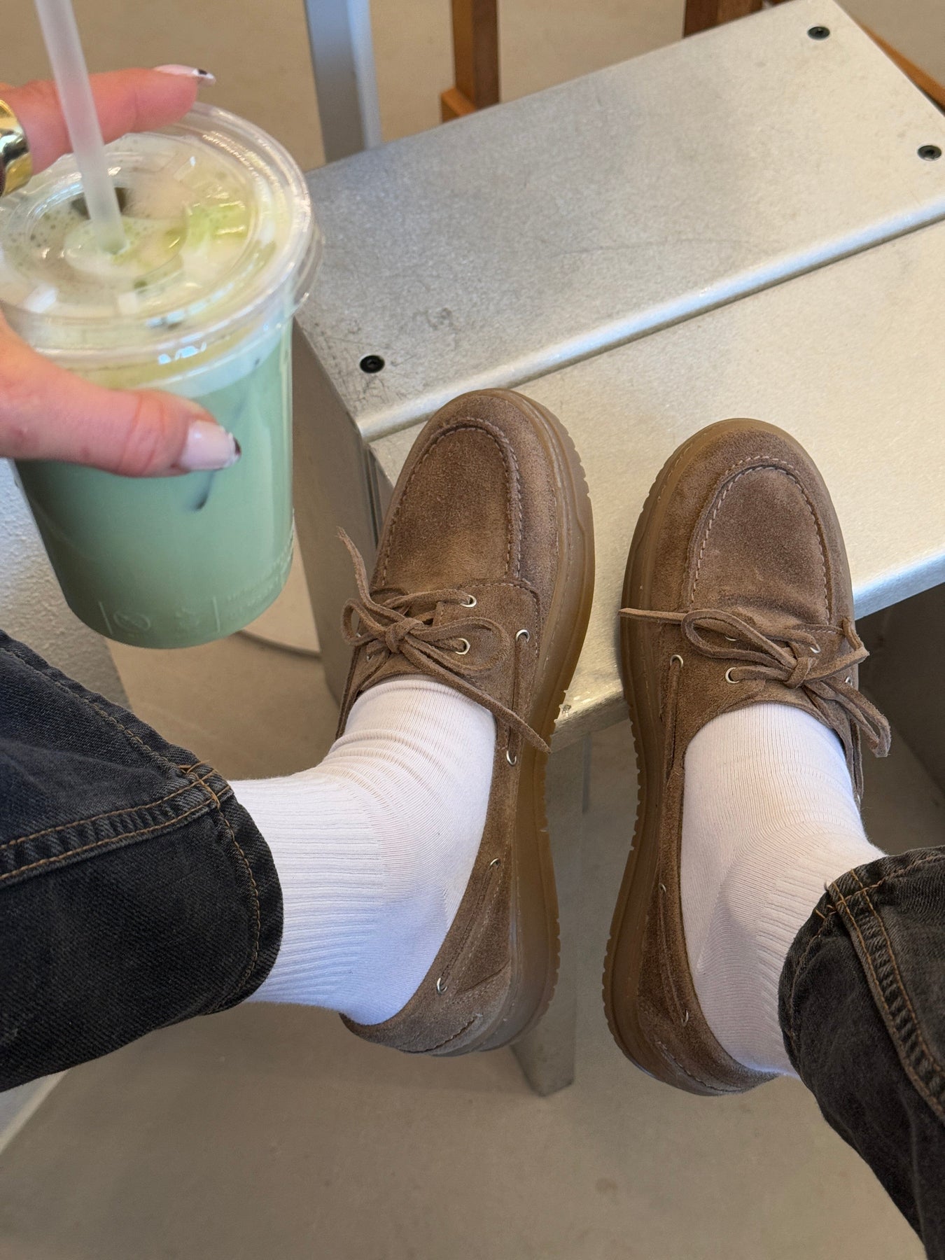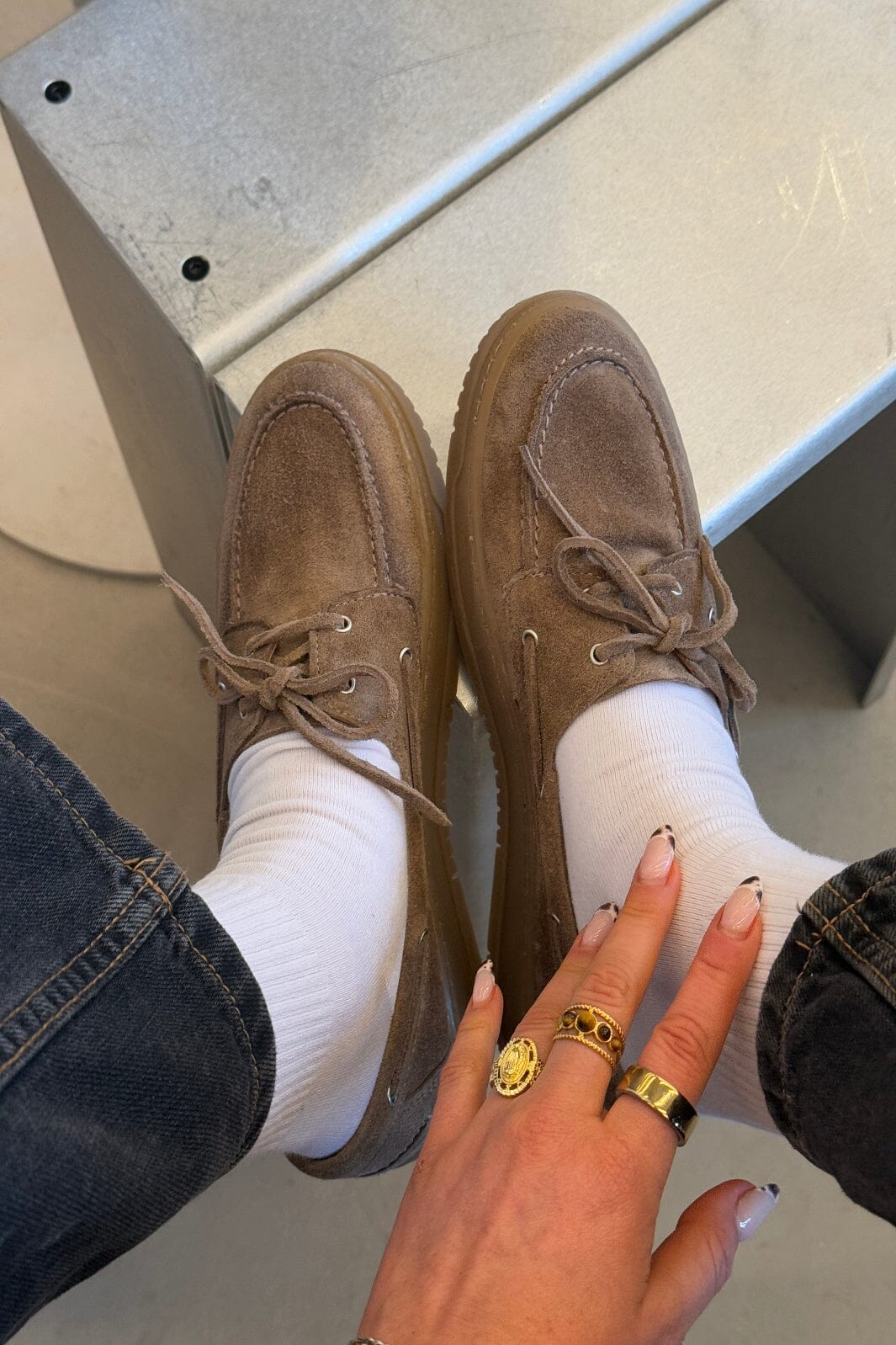 Brązowe buty od Phenumb Copenhagen z zamszu, z okrągłym noskiem i sznurowadłami. But ma niski obcas i solidną konstrukcję, co czyni go praktycznym do codziennego użytku.