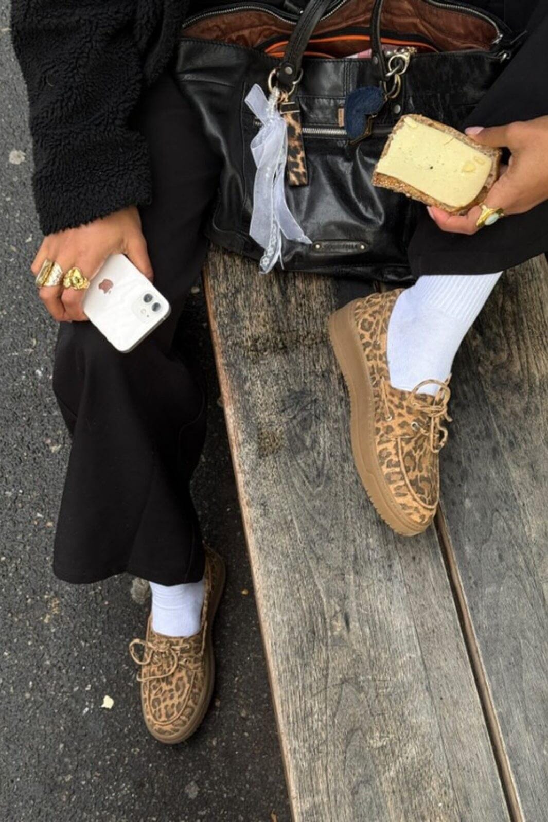 Buty z zamszu w brązowy wzór w panterkę. Buty mają okrągły czubek i sznurowanie, które zapewnia dobre dopasowanie.
