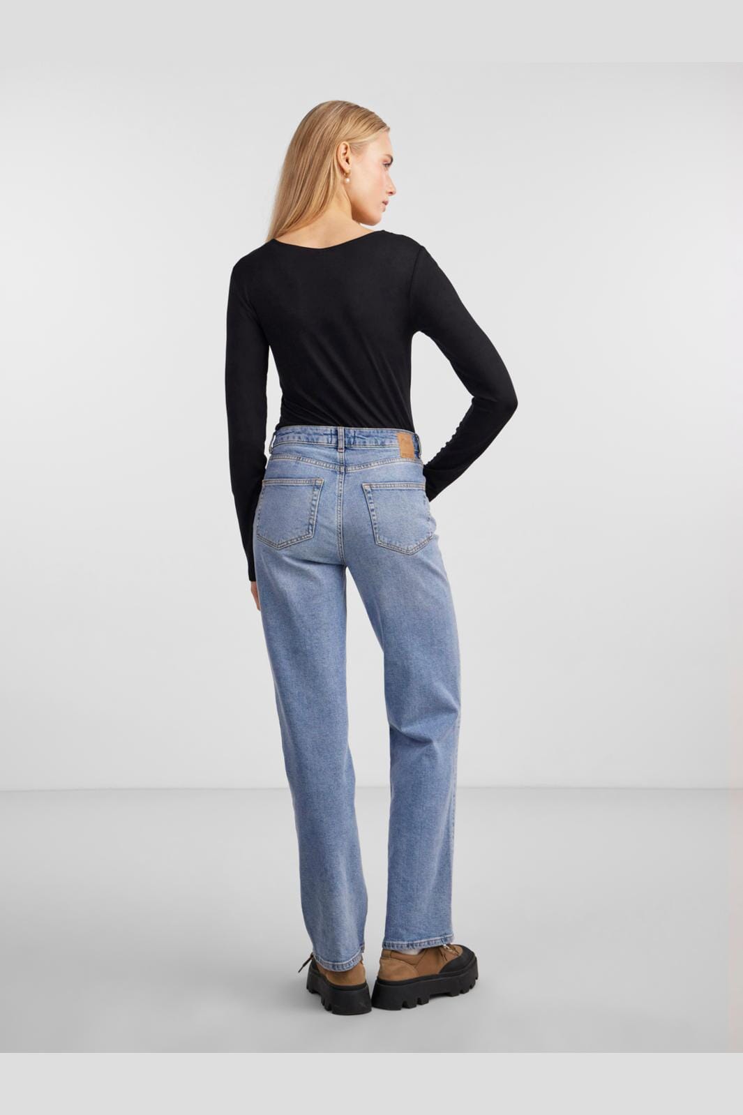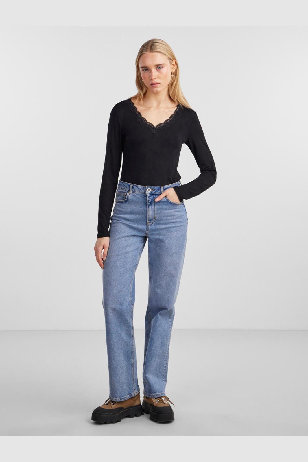 Czarna bluzka z długim rękawem od Pieces z koronkowymi detalami wzdłuż dekoltu V. Bluzka ma standardowy krój i może być noszona zarówno na co dzień, jak i na imprezy.