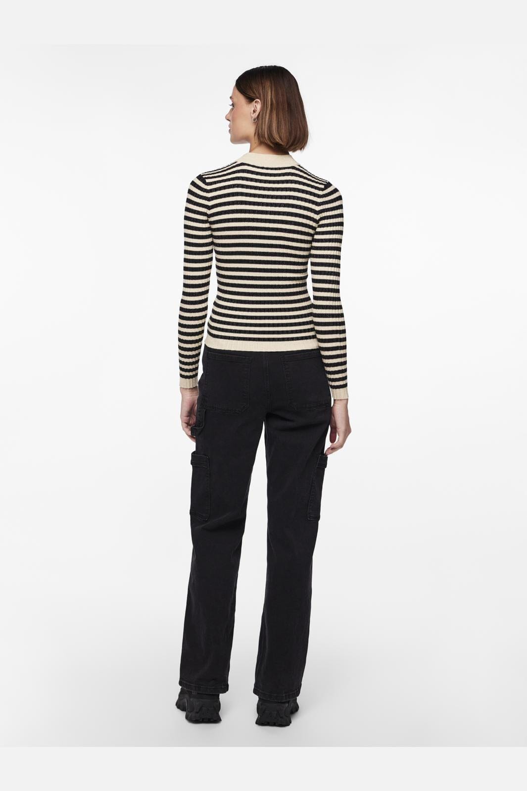 Sweter w paski od Pieces z okrągłym dekoltem i długimi rękawami. Sweter ma czarne i białe paski z wplecionymi złotymi nitkami, które nadają projektowi subtelny blask.