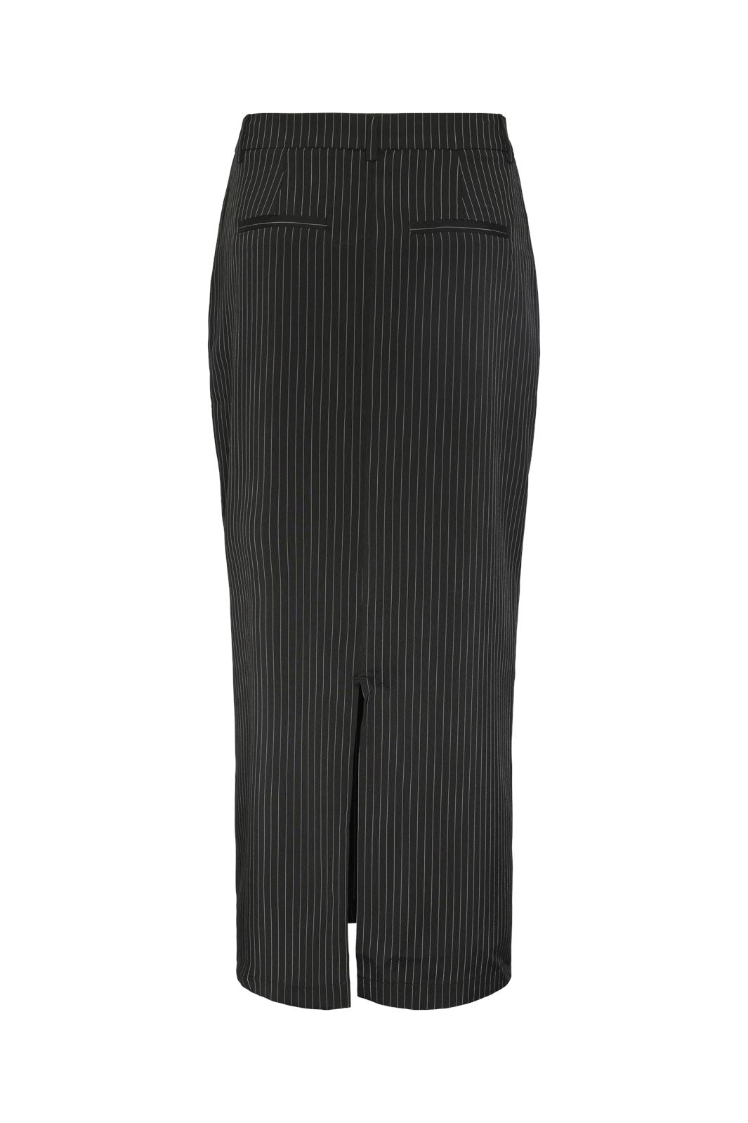 Czarna spódnica od Pieces w białe paski. Ma długość do kostek i dopasowany krój z dwiema kieszeniami oraz rozcięciem z tyłu. Spódnica ma normalną wysokość w talii.