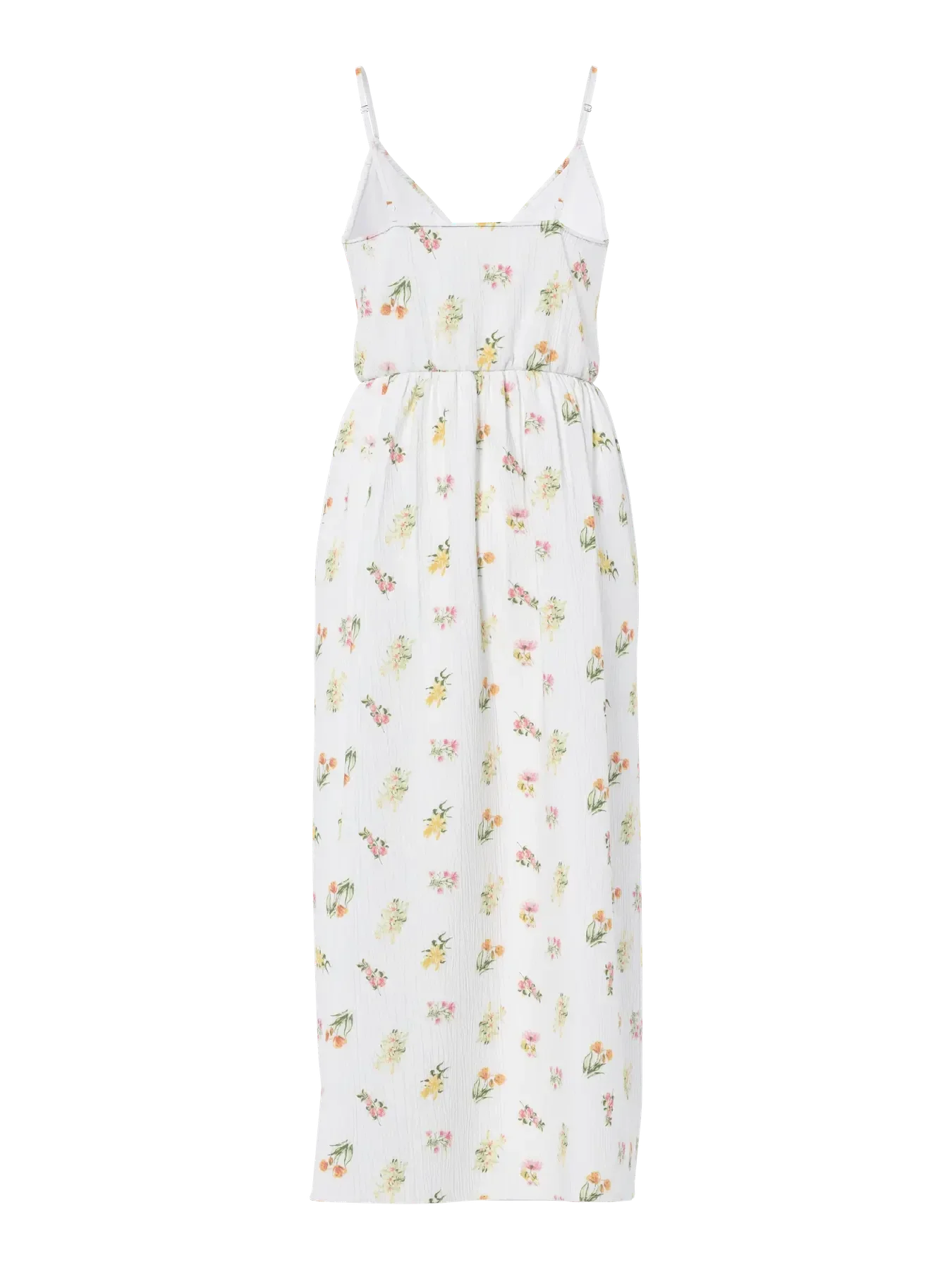 Biała sukienka marki Pieces z kwiatowym nadrukiem w jasnych kolorach. Wykonana w 100% z bawełny organicznej, z cienkimi ramiączkami i długością do kostek.