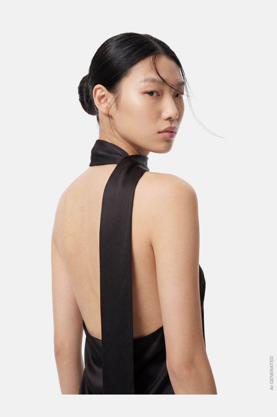 Czarna satynowa sukienka marki Pieces o asymetrycznym kroju z wiązaniem przy szyi. Sukienka ma gładką powierzchnię i sprawdzi się zarówno na uroczyste, jak i formalne okazje.