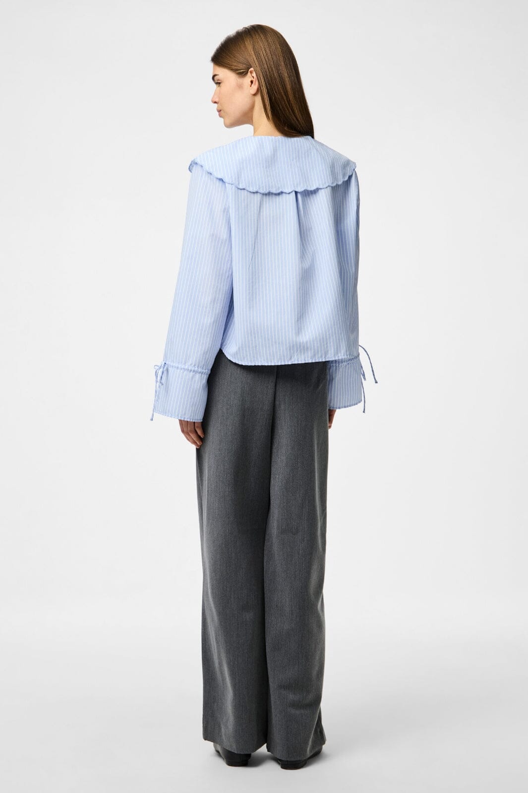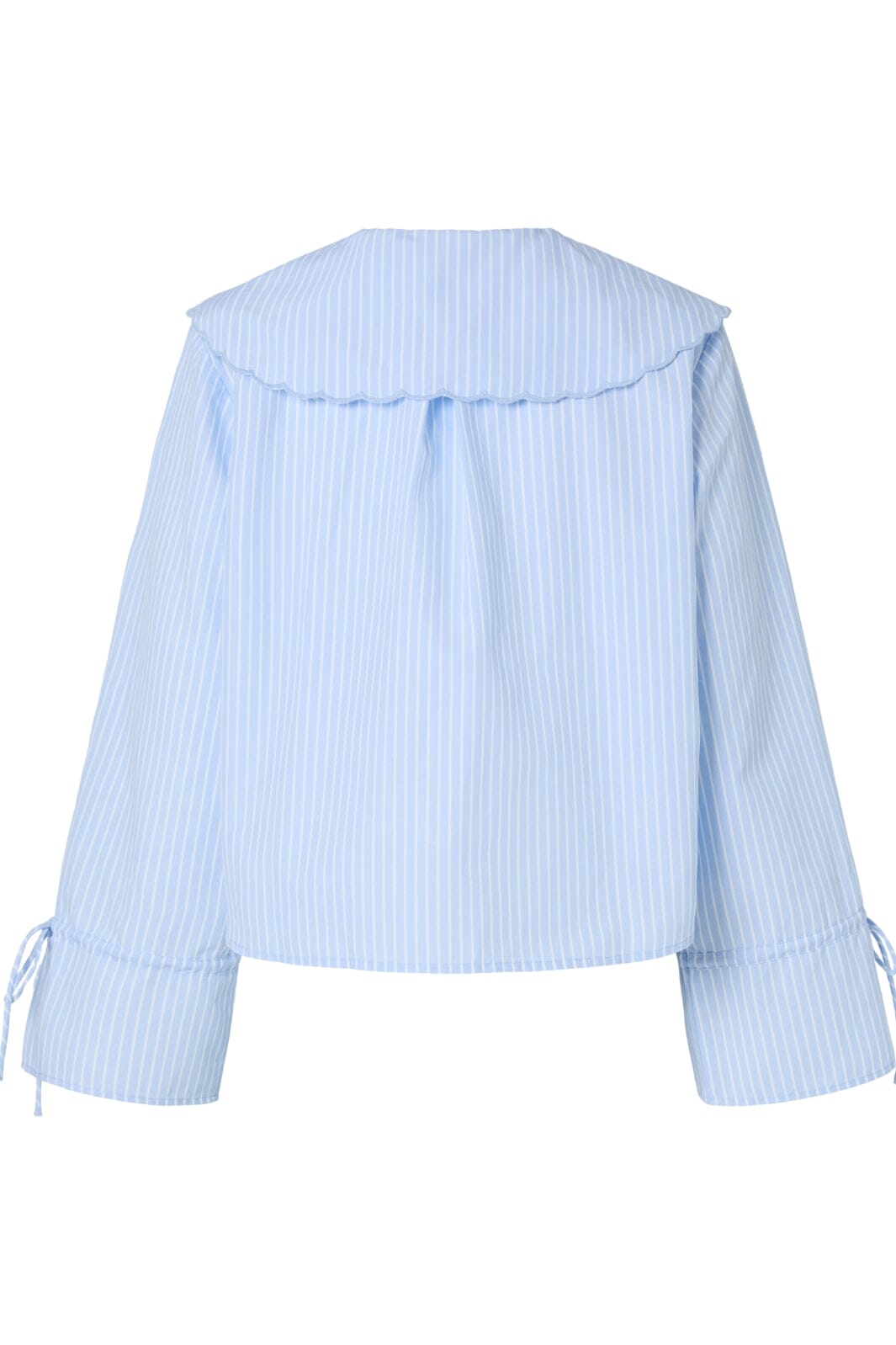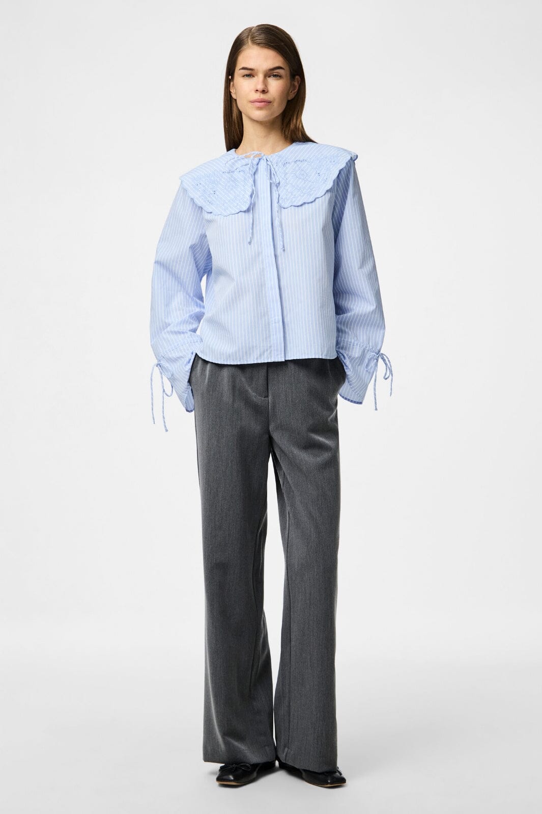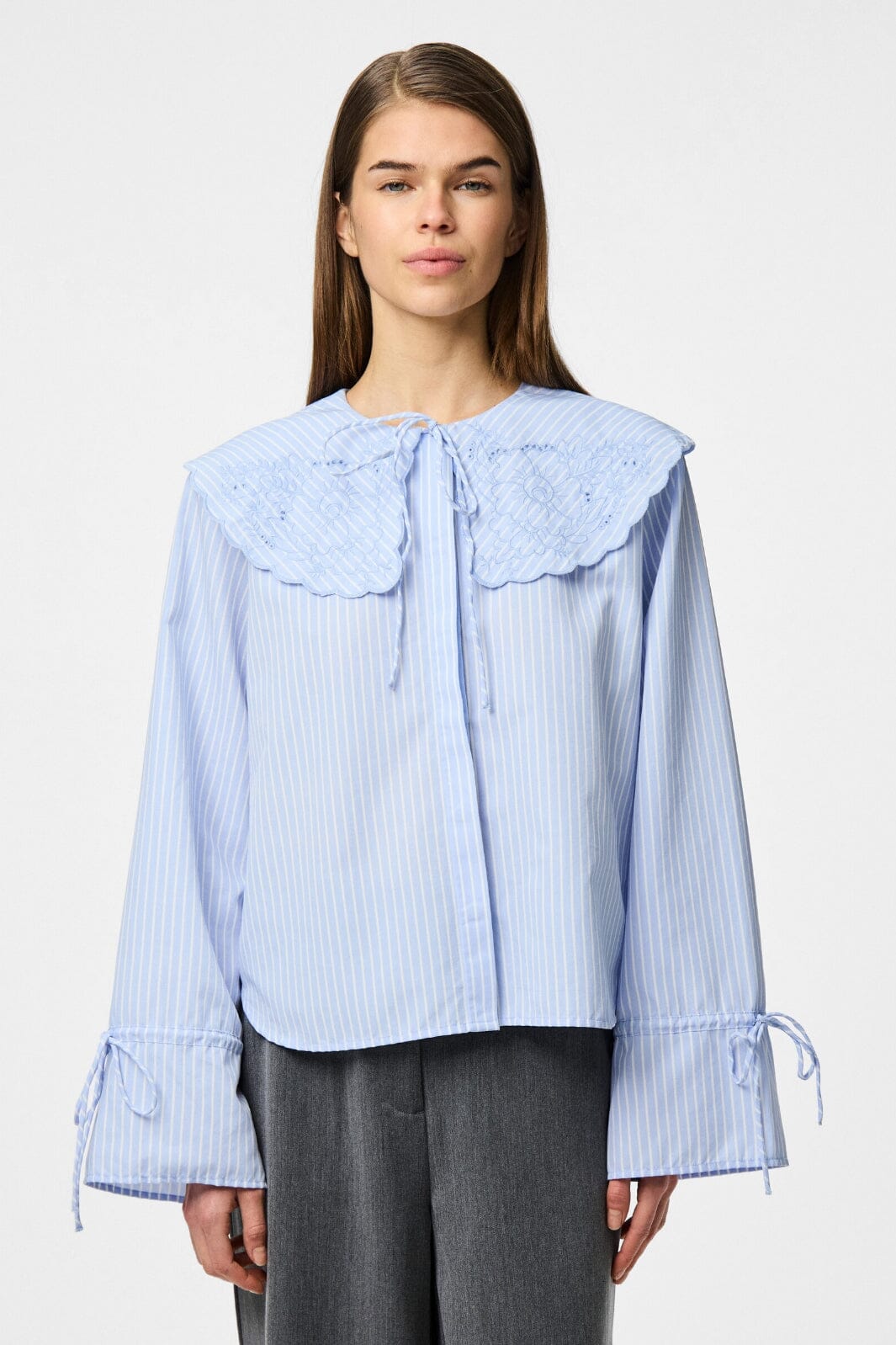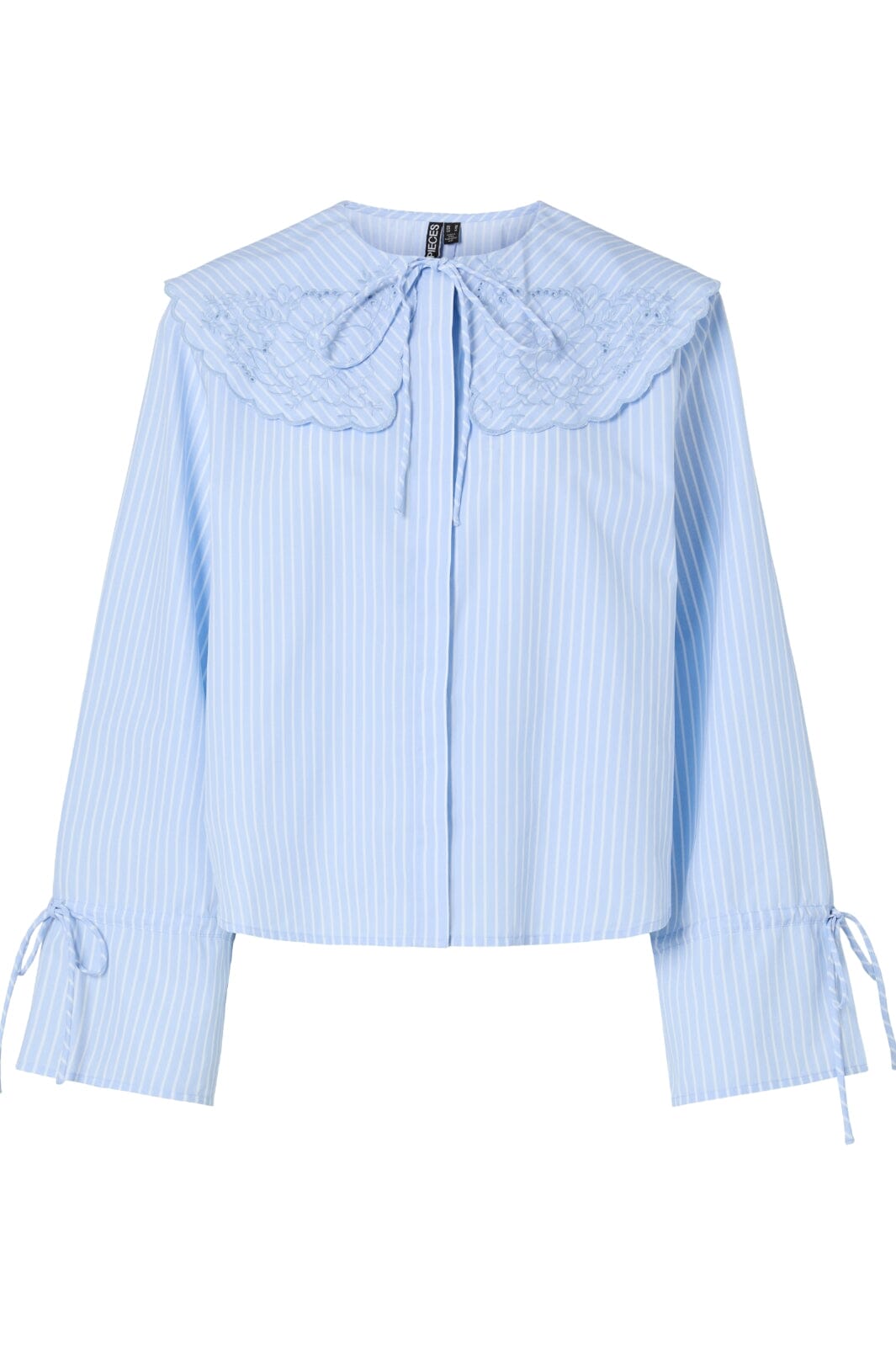 Jasnoniebieska w paski koszula od Pieces z dużym kołnierzem i haftowanymi detalami. Koszula ma falbany i wiązane detale przy rękawach i kołnierzu oraz zapięcie na guziki z przodu.
