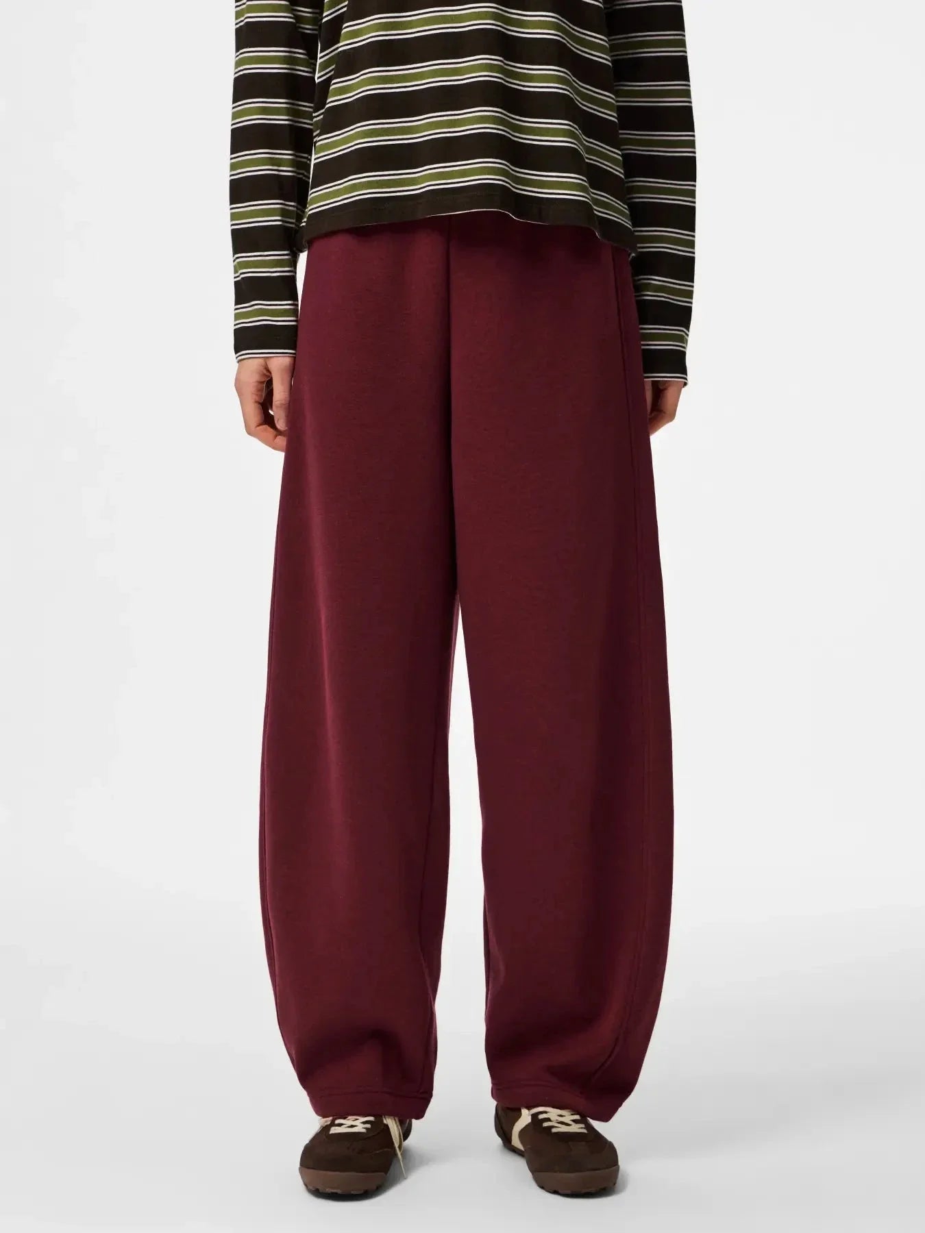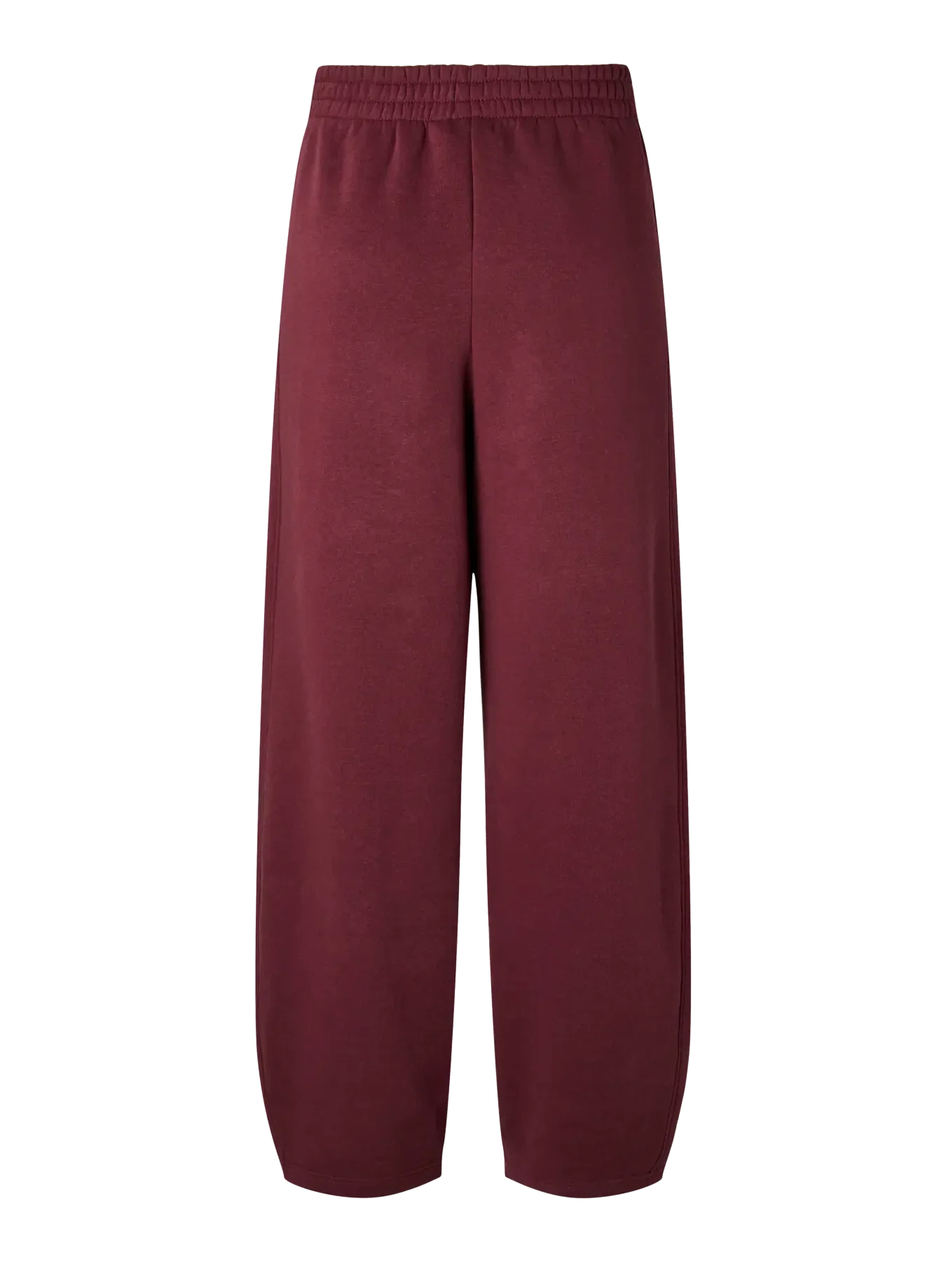 Spodnie typu barrel od Pieces w głębokim czerwonobrązowym kolorze. Spodnie mają luźny krój z szerokimi nogawkami i elastycznym pasem.