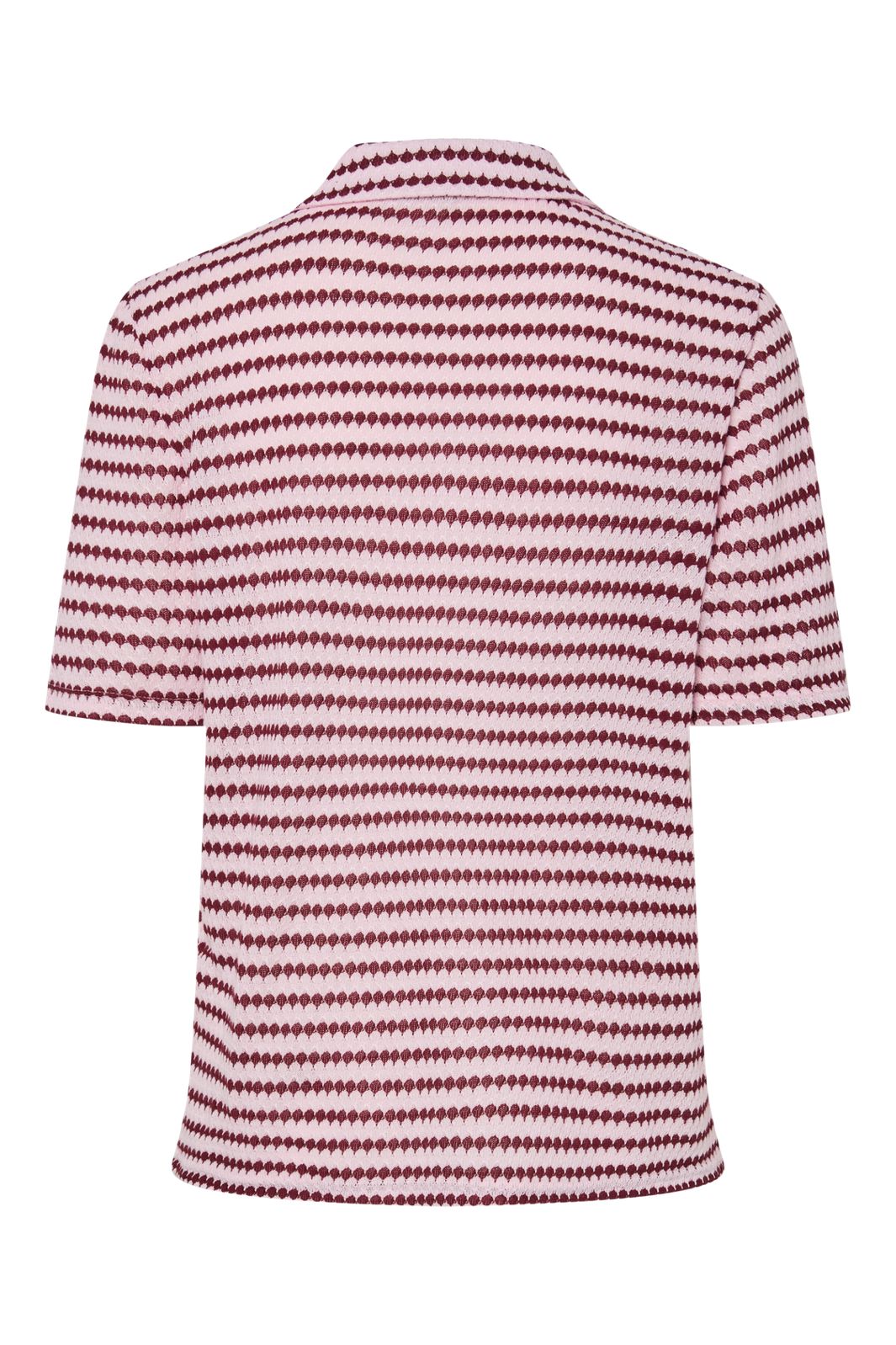 Polo od Pieces w różowym kolorze z bordowymi paskami. Ma dekolt w kształcie V z kołnierzykiem polo i krótkimi rękawami. Materiał ma ciągły wzór w paski w dwóch kolorach.