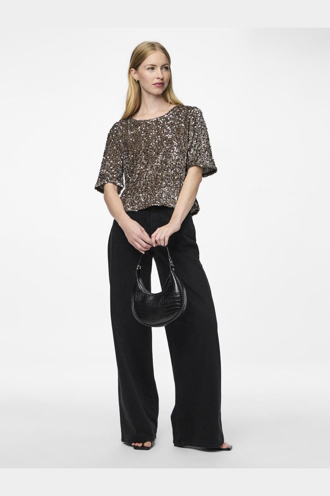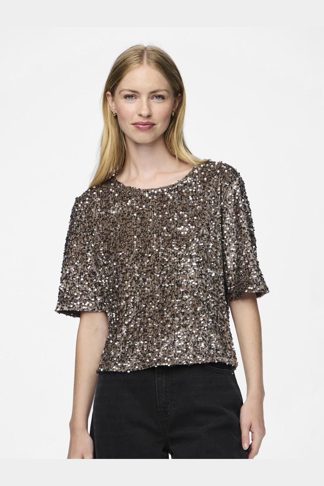 Krótkie rękawy top od Pieces w kolorze brązowym i srebrnym. Top jest całkowicie pokryty błyszczącymi cekinami i ma okrągły dekolt. Jest uszyty w regular fit, co zapewnia dobrą swobodę ruchów.