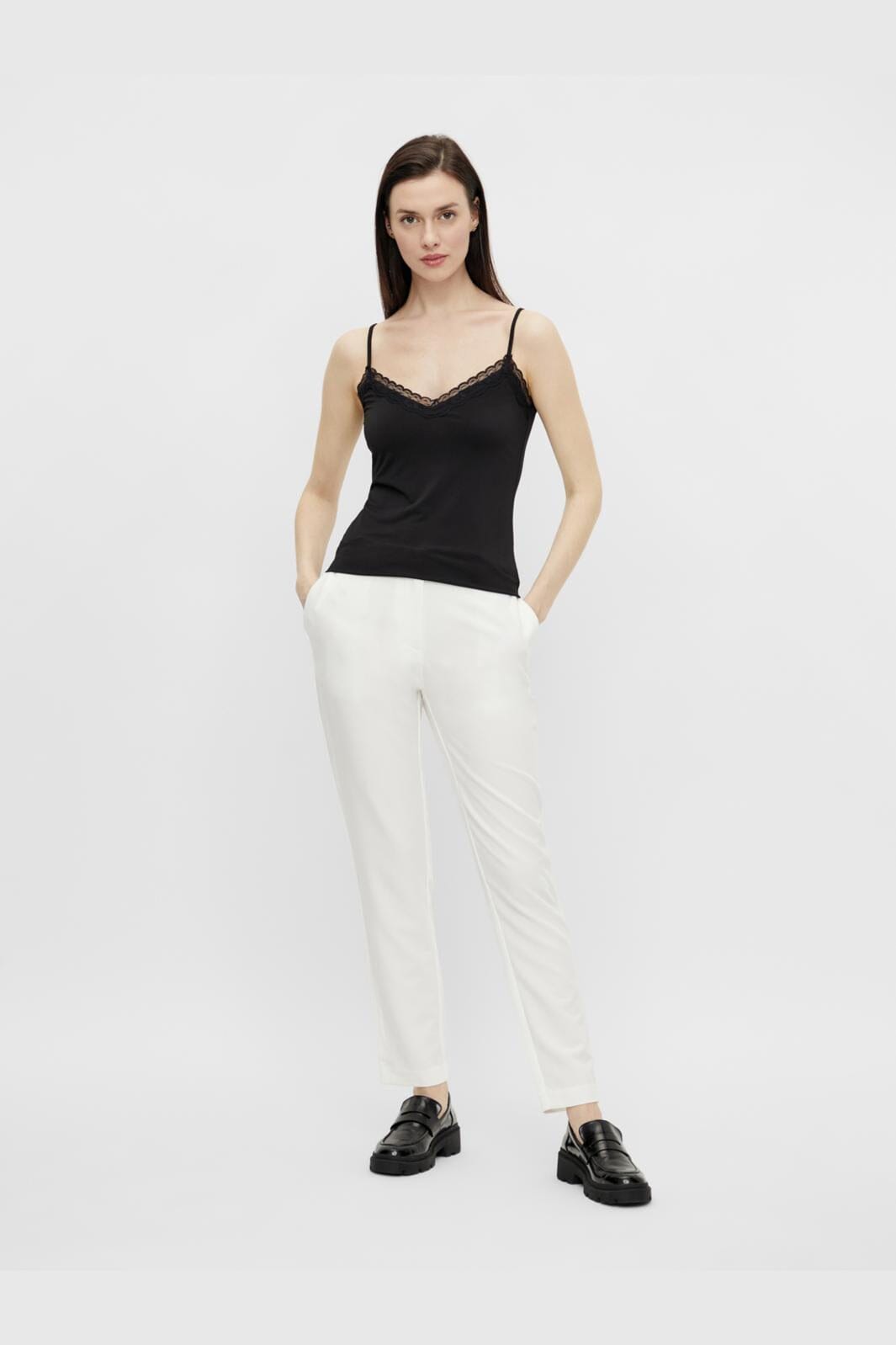 Czarny top od Pieces z koronkowymi detalami wzdłuż dekoltu V. Top ma cienkie ramiączka spaghetti i regularny krój, który zapewnia wygodne dopasowanie.