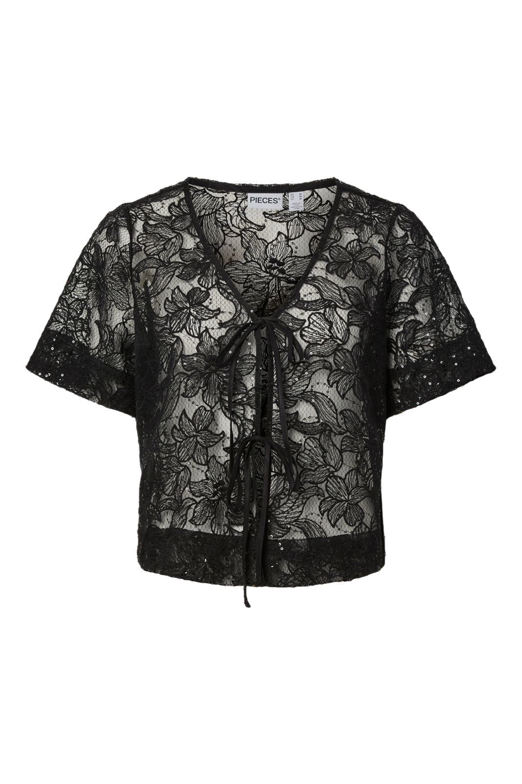 Czarna bluzka Pieces z dekoltem w serek i koronką w kwiaty. Bluzka ma krótkie rękawy oraz wiązanie z przodu z cekinami.