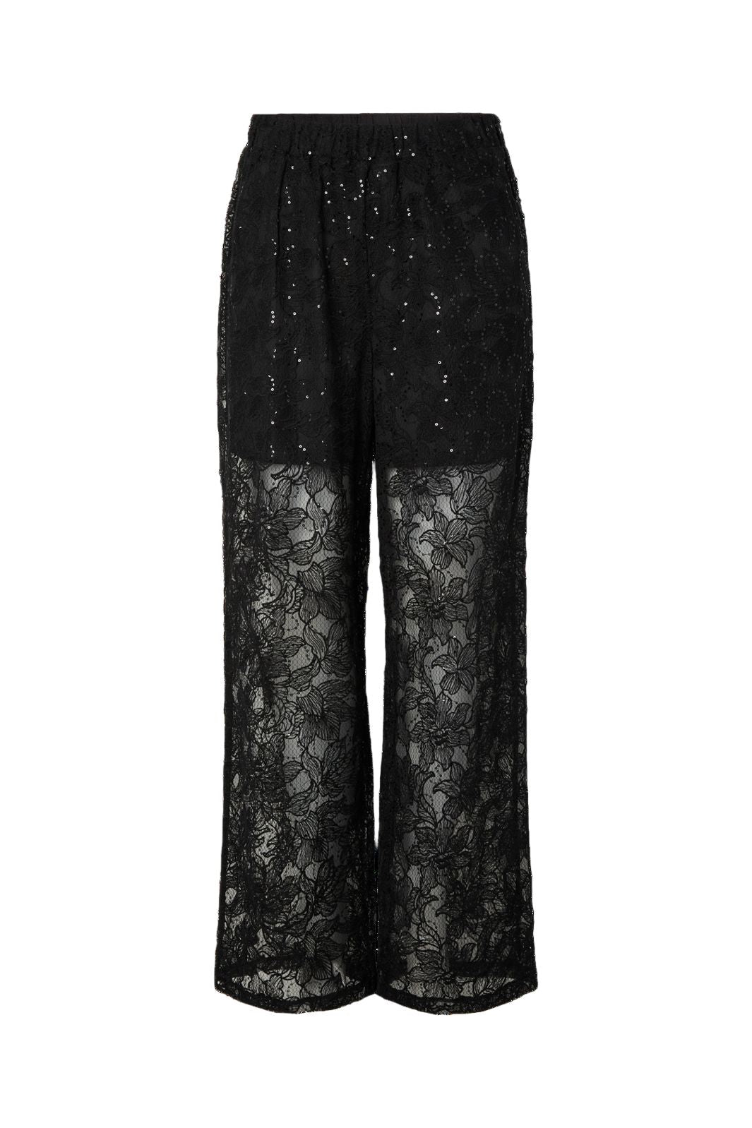 Czarne spodnie marki Pieces z cekinami w górnej części i przezroczystą koronkową warstwą od ud w dół.