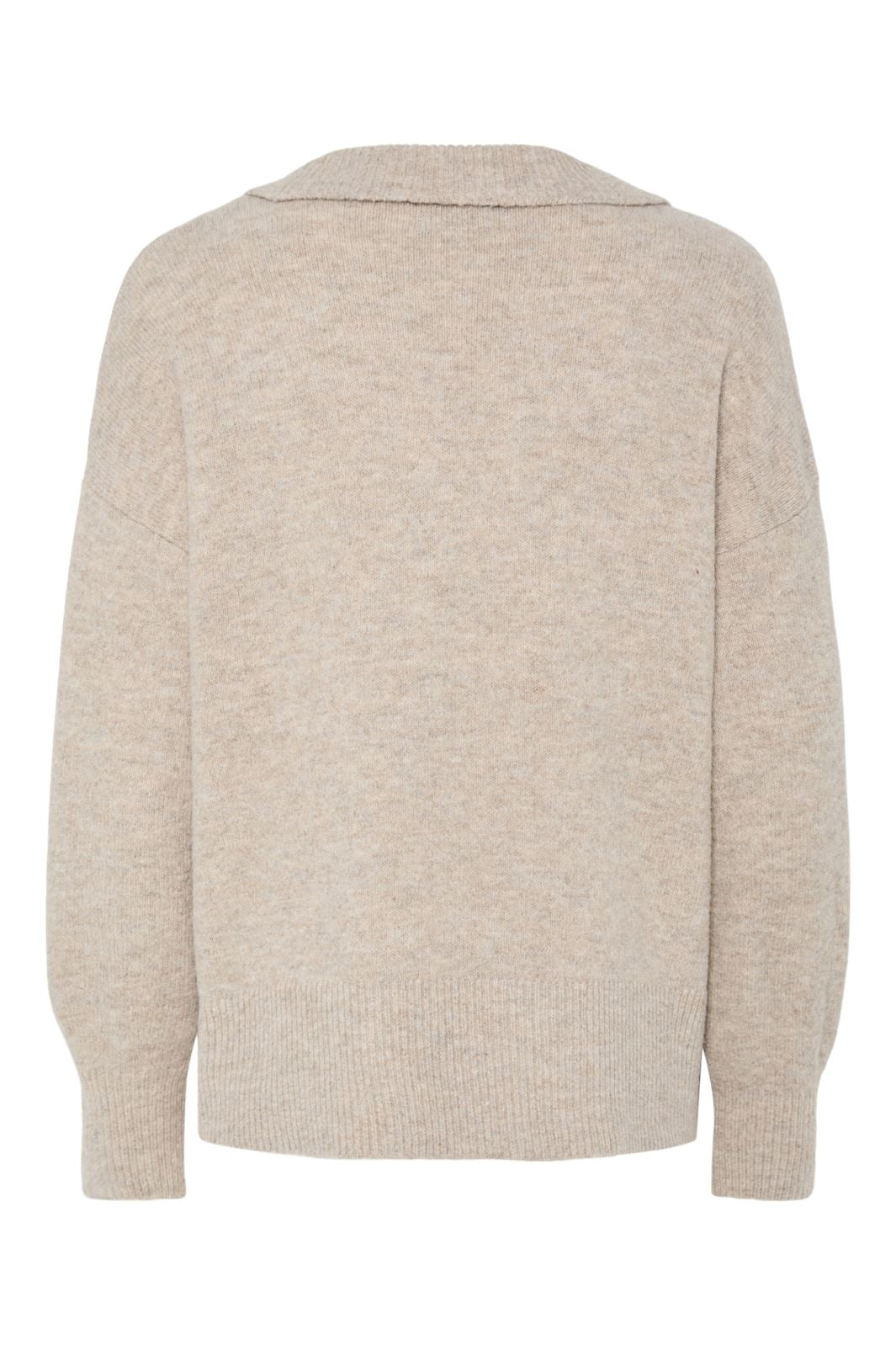 Sweter od Pieces w melanżu taupe szarym. Miękki sweter z kołnierzem polo i długimi rękawami, wykonany z przyjemnej mieszanki materiałów z recyklingowanego poliestru i wełny.