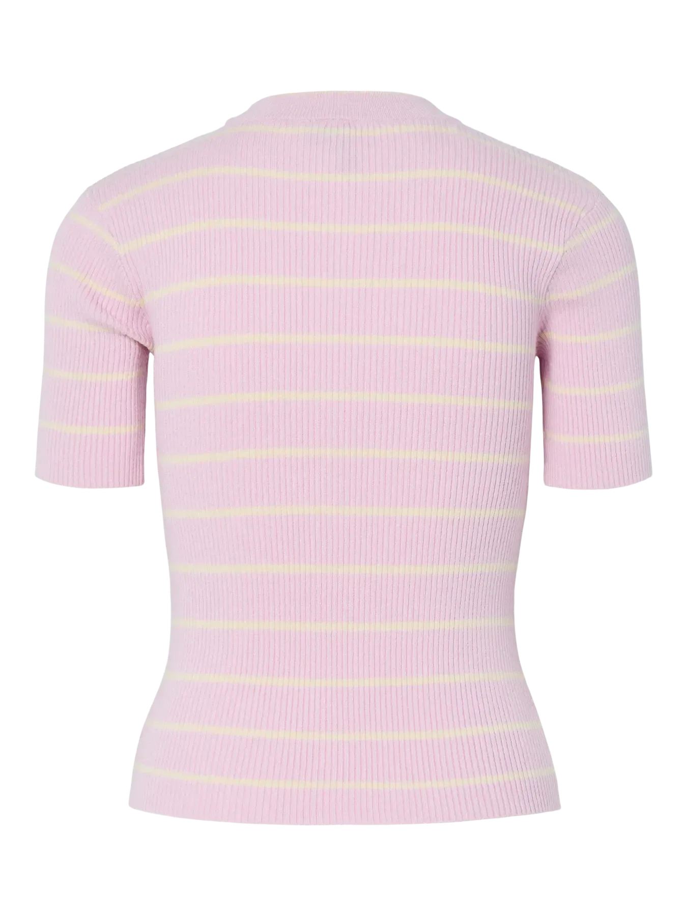Dzianinowy top marki Pieces w jasnofioletowym kolorze z różowymi paskami. Top ma krótkie rękawy, okrągły dekolt i dopasowany krój.
