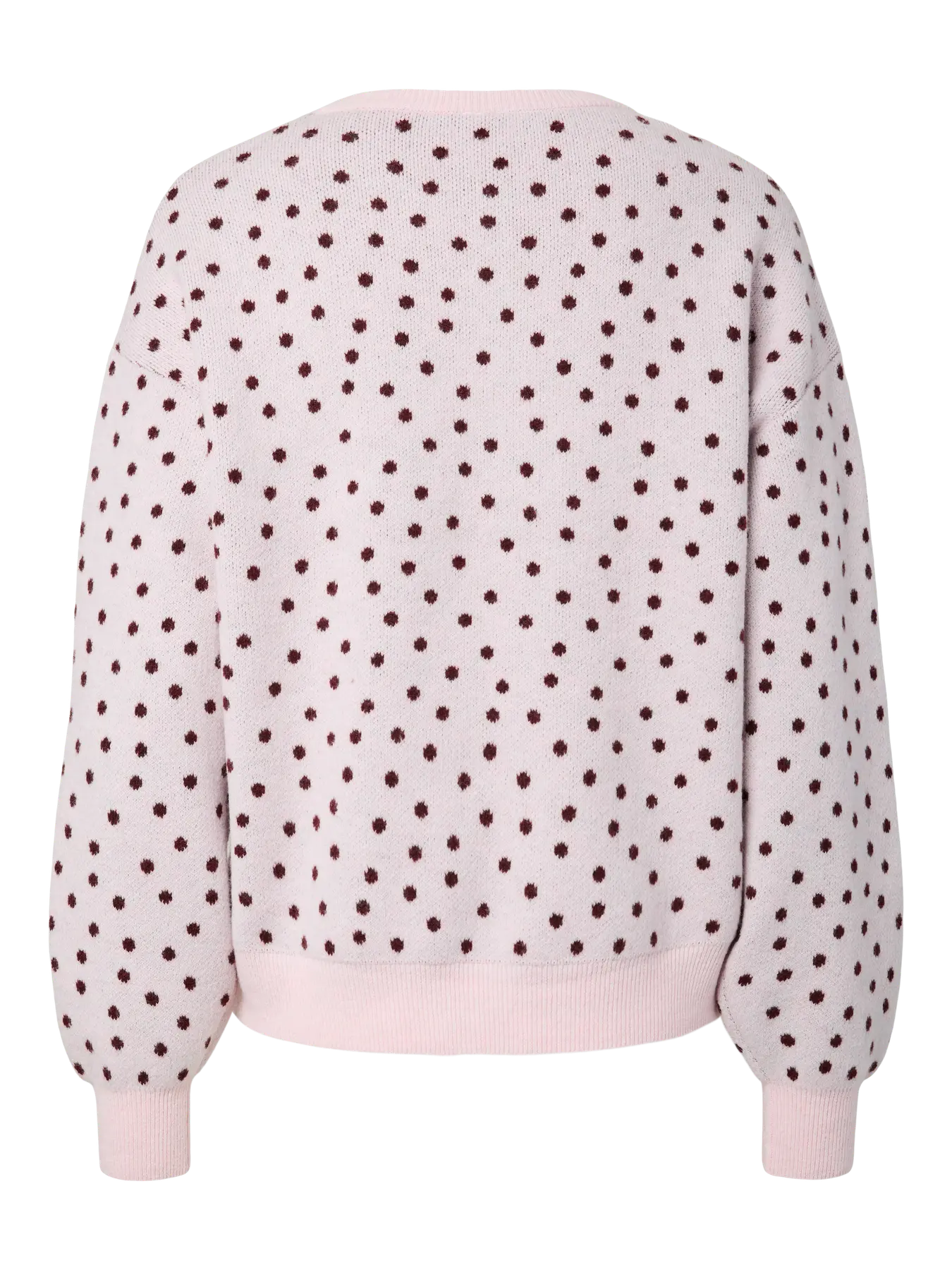 Sweter dzianinowy Pieces w różowym kolorze z ciemnoczerwonymi kropkami. Sweter ma okrągły dekolt oraz prążkowane ściągacze przy nadgarstkach i na dole.