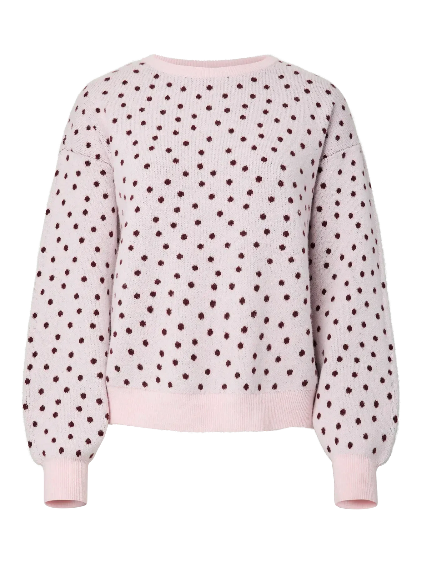 Sweter dzianinowy Pieces w różowym kolorze z ciemnoczerwonymi kropkami. Sweter ma okrągły dekolt oraz prążkowane ściągacze przy nadgarstkach i na dole.