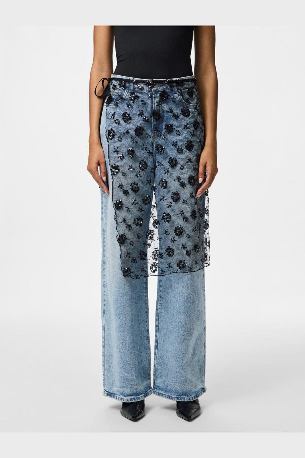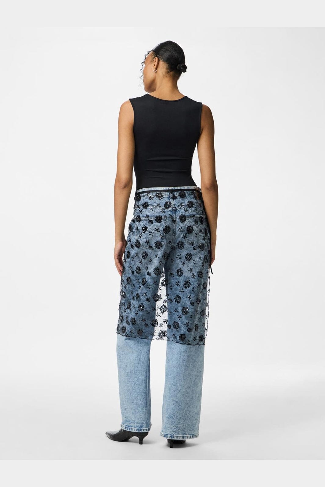 Czarny sarong od Pieces, wykonany z przezroczystego koronki z kwiatowym wzorem. Sarong ma czarne cekiny i sznurek w talii.