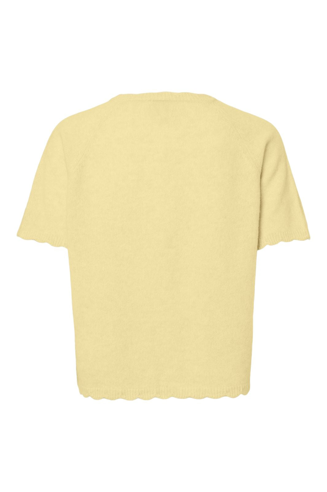 Krótkorękawowy kardigan od Pieces w kolorze French Vanilla z okrągłym dekoltem. Dzianinowy design z falbaniastymi krawędziami i dekoracyjnymi szwami wzdłuż krawędzi.