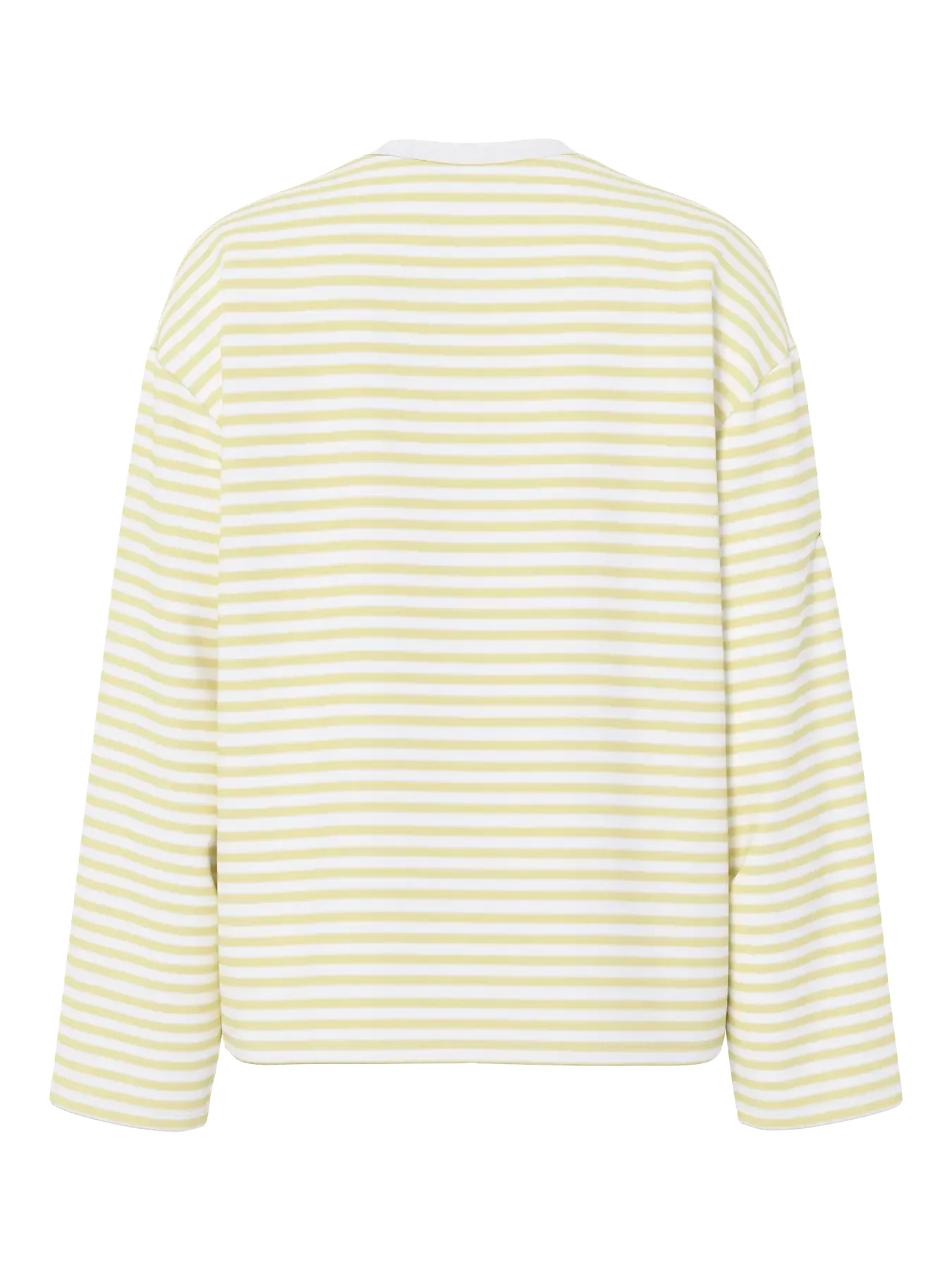 Prążkowany top z długim rękawem od Pieces w kolorze białym i jasnożółtym. Ma oversize’owy krój i okrągły dekolt.