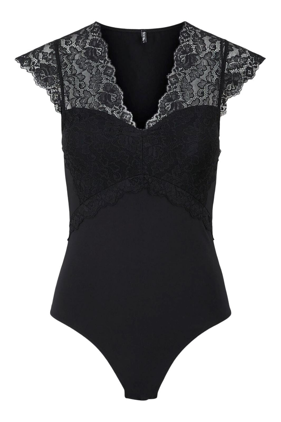 Czarny bodystocking od Pieces z koronkowymi detalami na ramionach i rękawach. Dekolt w kształcie litery V i dopasowany krój tworzą piękną sylwetkę.