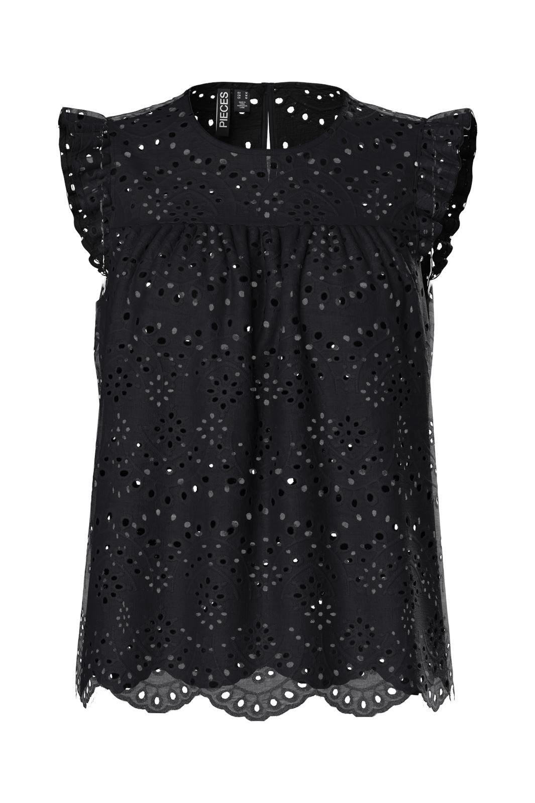Czarna bluzka od Pieces z haftowanym wzorem i koronką. Top ma okrągły dekolt i krótkie, marszczone rękawy z falbaniastym wykończeniem na dole.