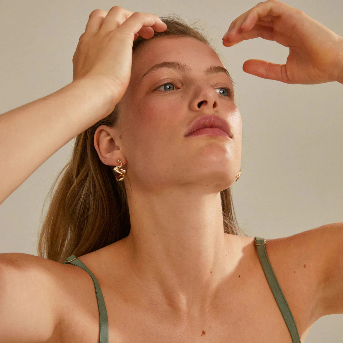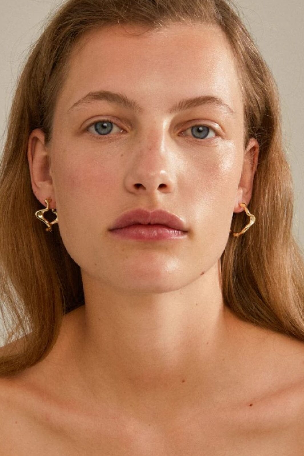 Złote kolczyki od Pilgrim o falistym, rzeźbiarskim designie. Kolczyki wykonane są z recyklingowanego mosiądzu z błyszczącą złotą powłoką, która podkreśla organiczny język formy.