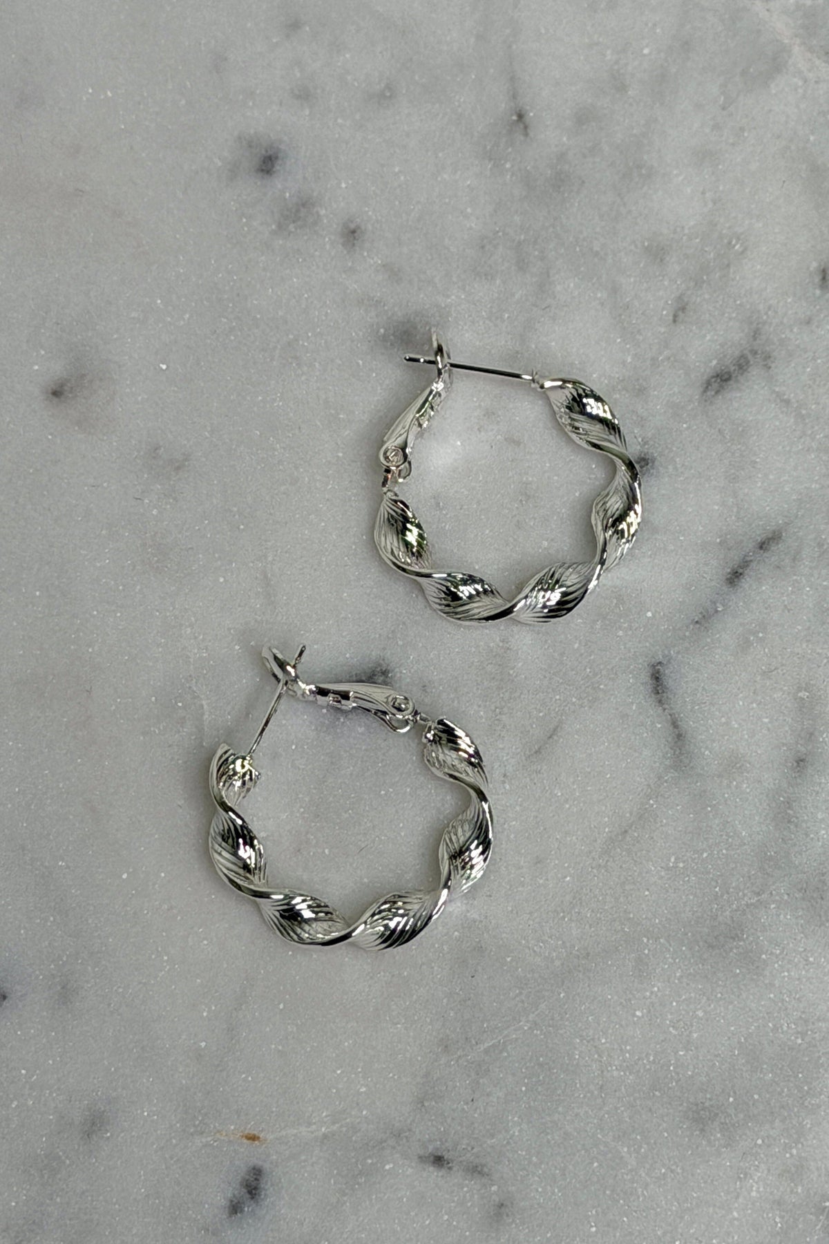 Srebrzone kolczyki marki Rooted z plecionym wzorem. Okrągłe koła mają widoczny mechanizm zapięcia, który zapewnia pewne mocowanie.