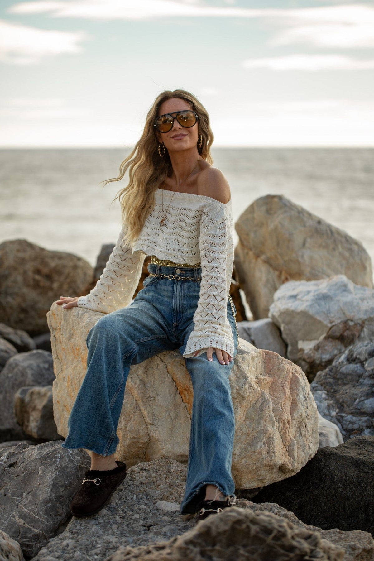 Naszyjnik marki Rooted z cienkim, złotym łańcuszkiem i kilkoma zawieszkami. Naszyjnik ma zawieszkę na sznurku z muszlami i pozłacanymi charmsami.