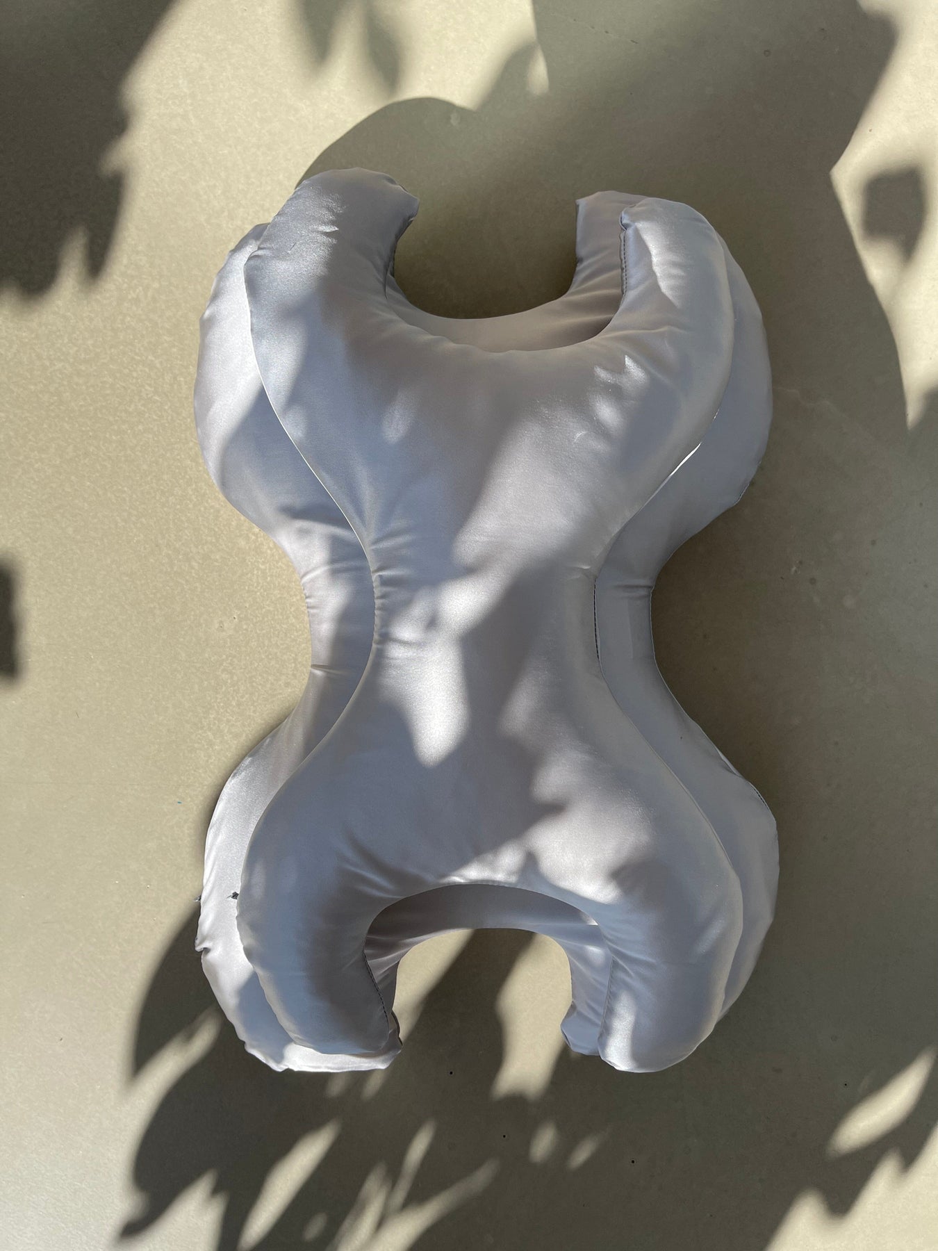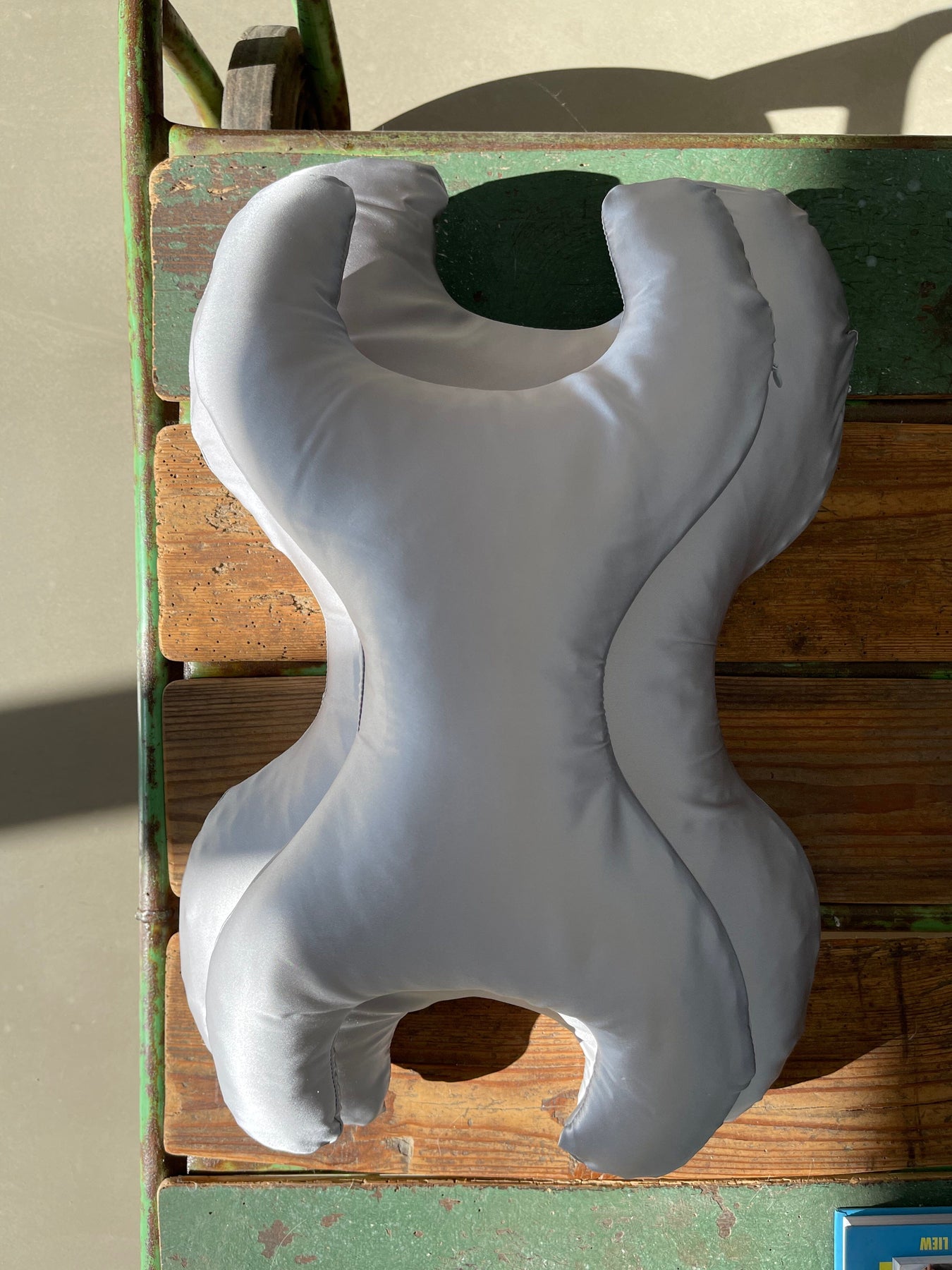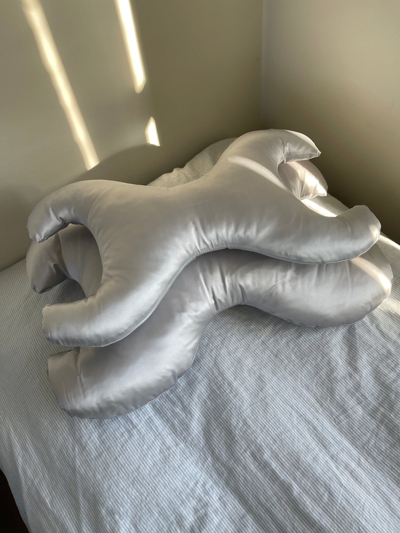 Poszewka od Save My Face w srebrnym charmeuse-silk. Poszewka ma gładką powierzchnię i jest zaprojektowana dla poduszki La Petite z charakterystycznym kształtem X.