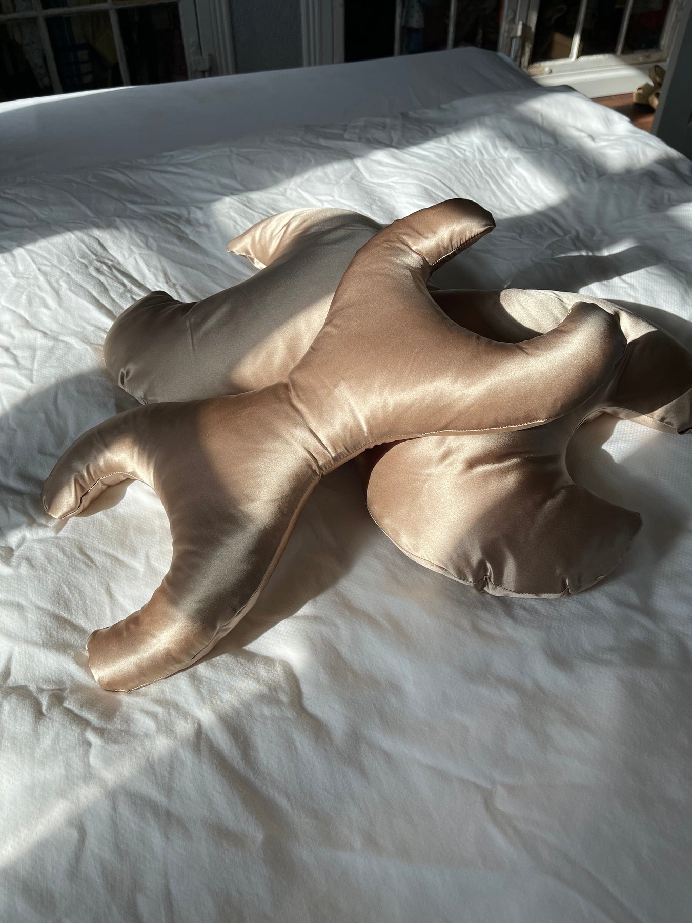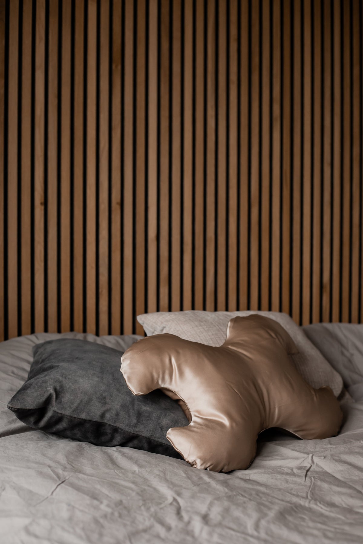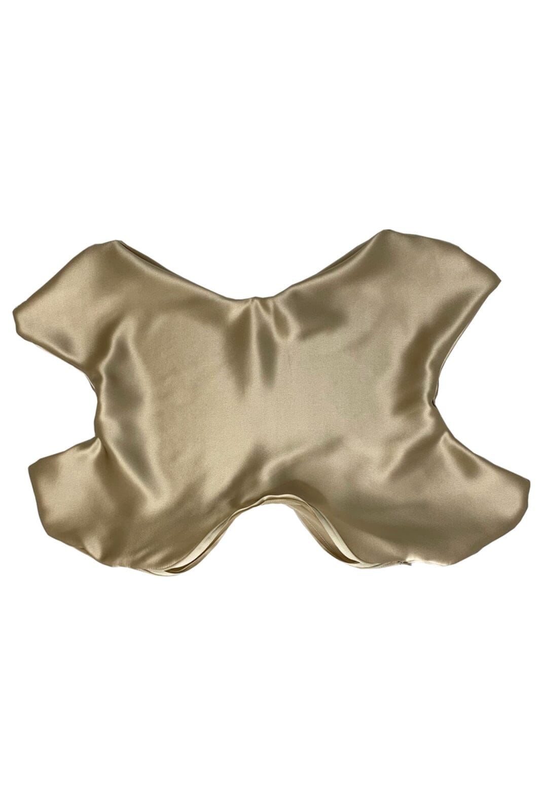 Poszewka od Save My Face z brązowego jedwabiu w kształcie X. Poszewka ma gładką powierzchnię i jest wykonana z jedwabiu charmeuse o naturalnych, przyjaznych dla skóry właściwościach.