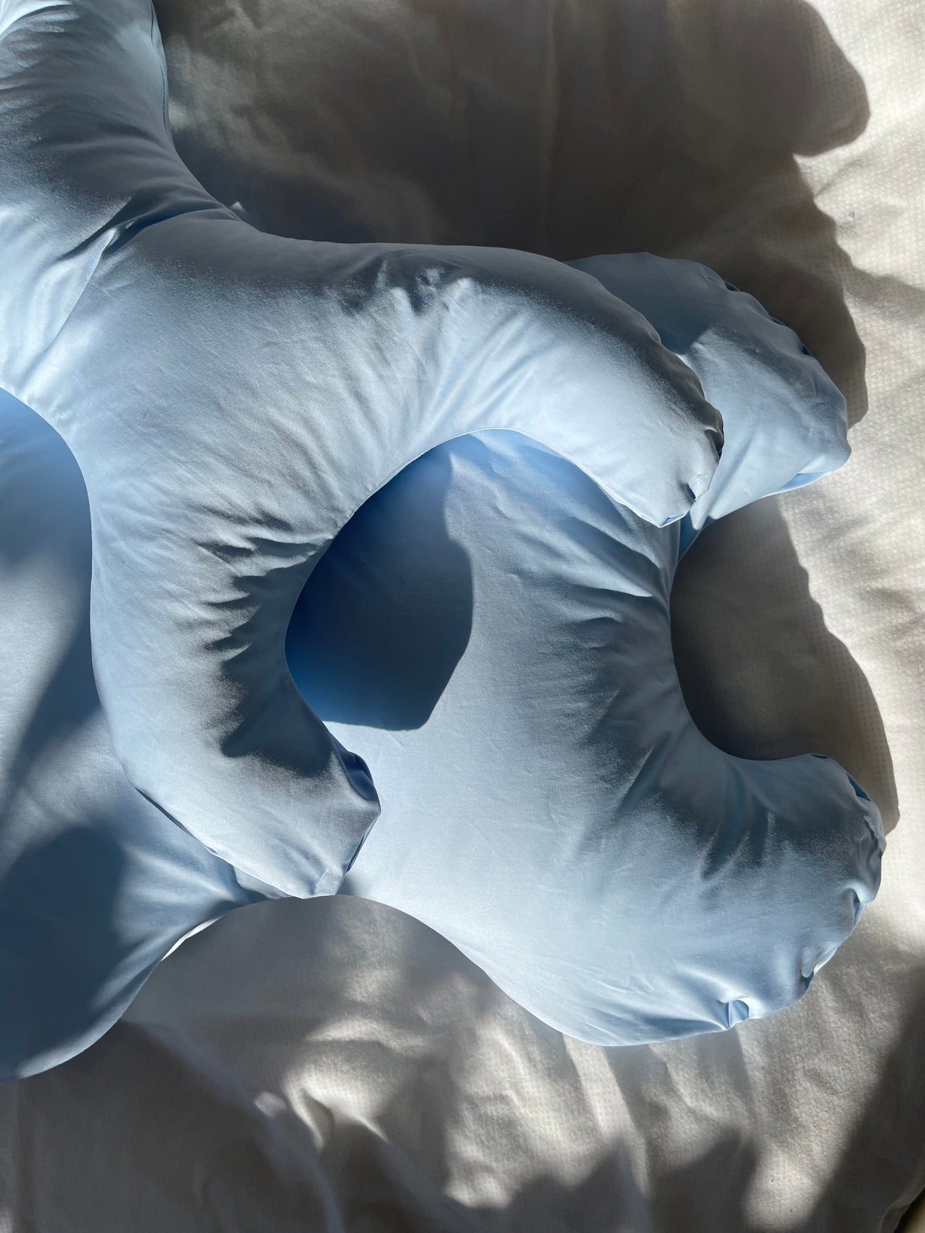 Mała poduszka o designie w kształcie X i jasnoniebieskim pokrowcu z 100 % bawełny. Poduszka jest wypełniona syntetycznymi włóknami, które są zarówno odporne na bakterie, jak i odpychające wilgoć.