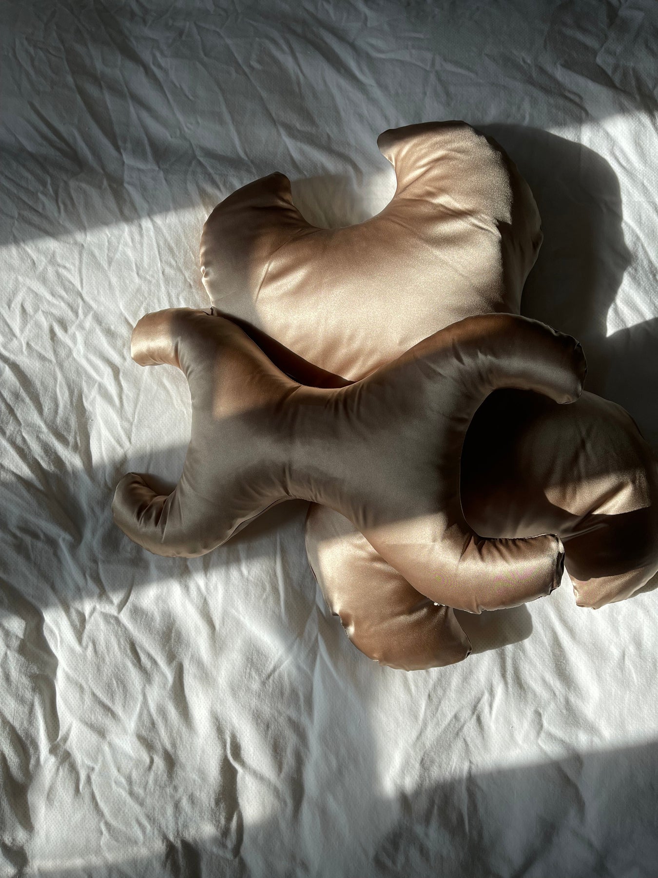 Mała poduszka z pokrowcem z brązowego jedwabiu od Save My Face. Poduszka ma kształt X i łączy włókna hipoalergiczne z regulującym temperaturę jedwabiem.