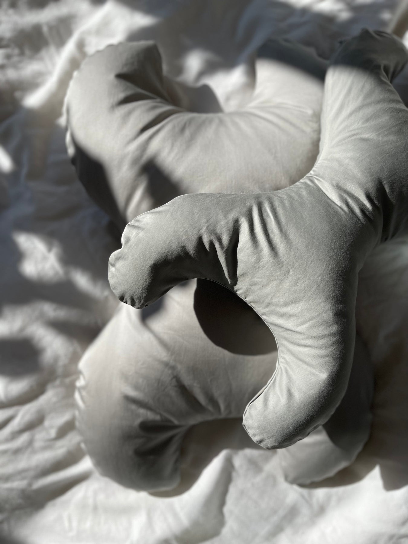 Szara poduszka o opatentowanym kształcie klepsydry od Save My Face. Specjalny kształt utrzymuje twarz wolną podczas snu, a zdejmowany pokrowiec ułatwia utrzymanie czystości.