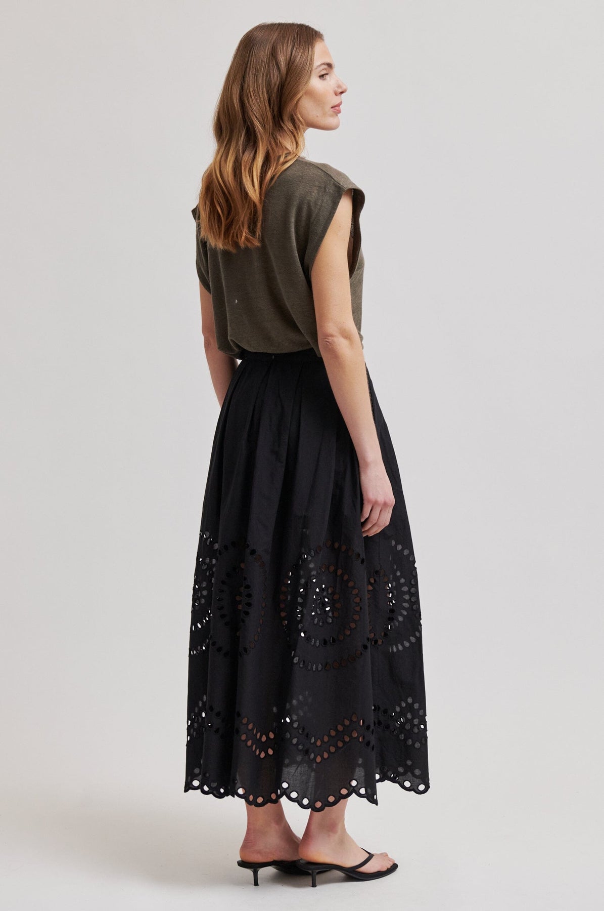 Czarna spódnica marki Second Female, wykonana z miękkiej bawełny. Spódnica ma haft typu cutwork w dolnej części oraz falowany brzeg.