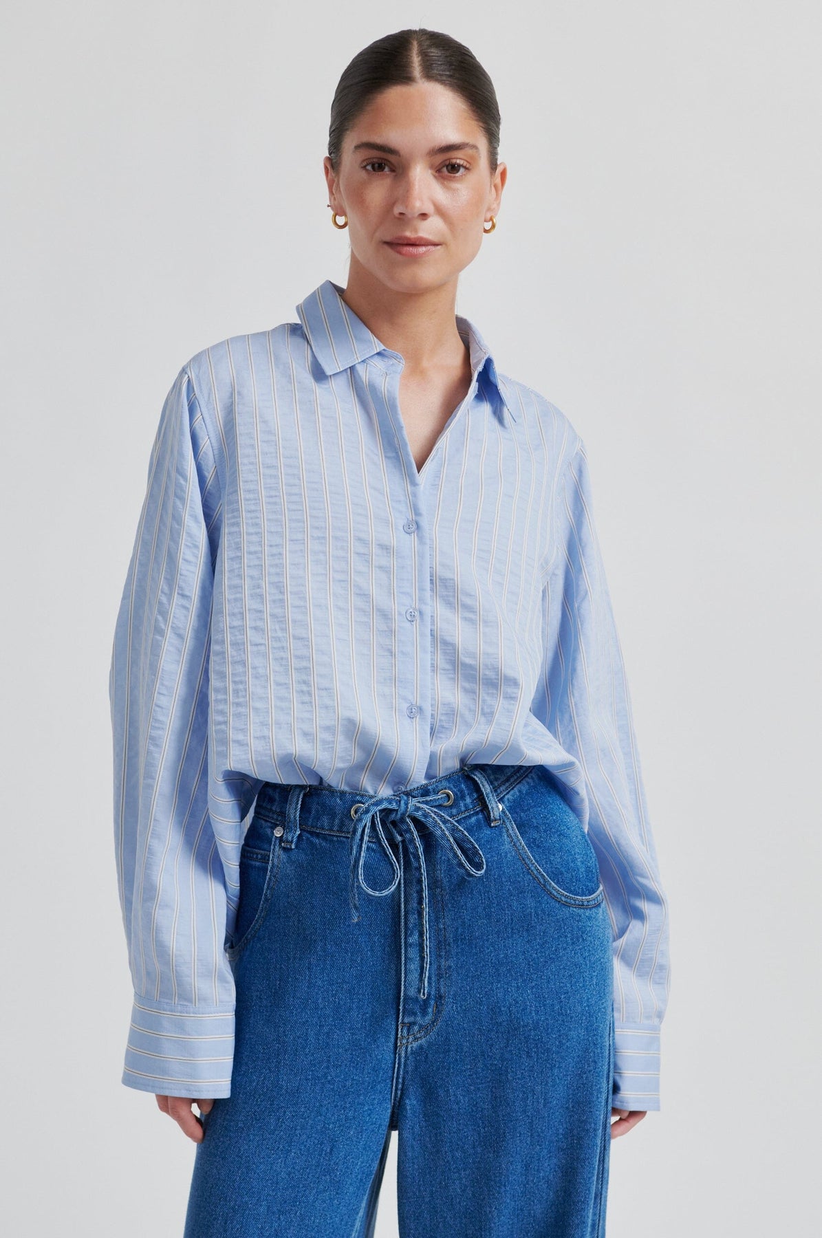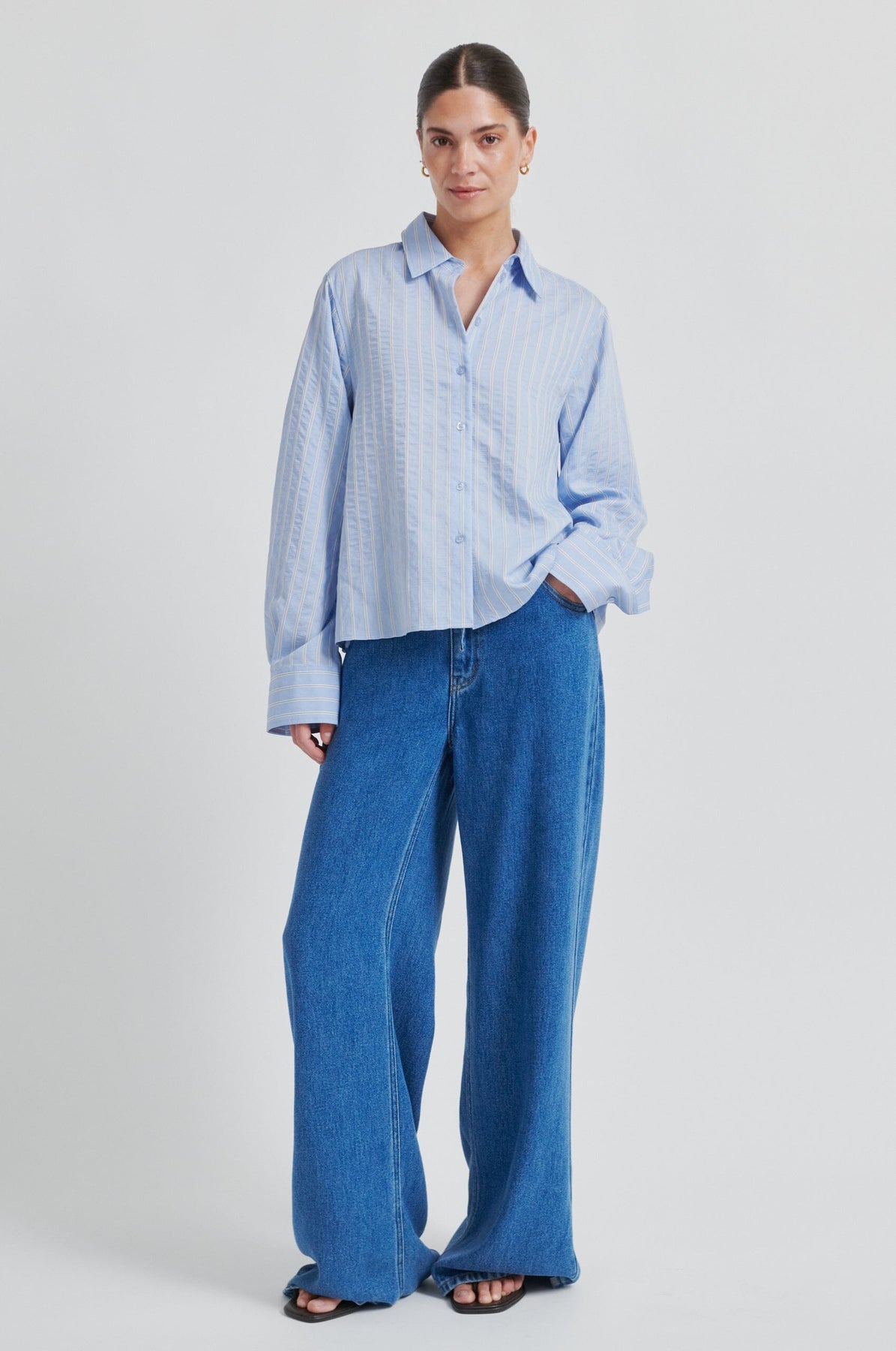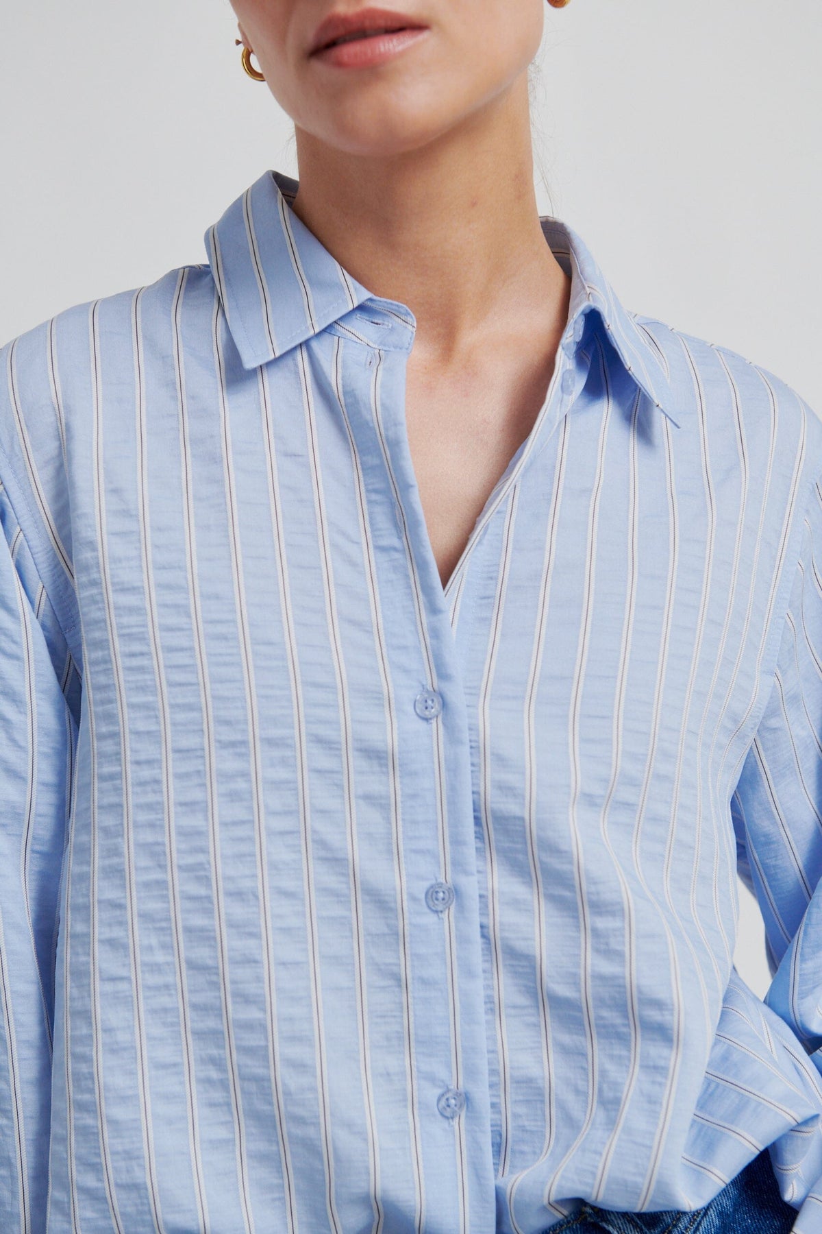 Jasnoniebieska koszula w białe paski od Second Female. Koszula wykonana jest z miękkiej mieszanki z 72% wiskozy i ma krótkim, luźnym krojem.