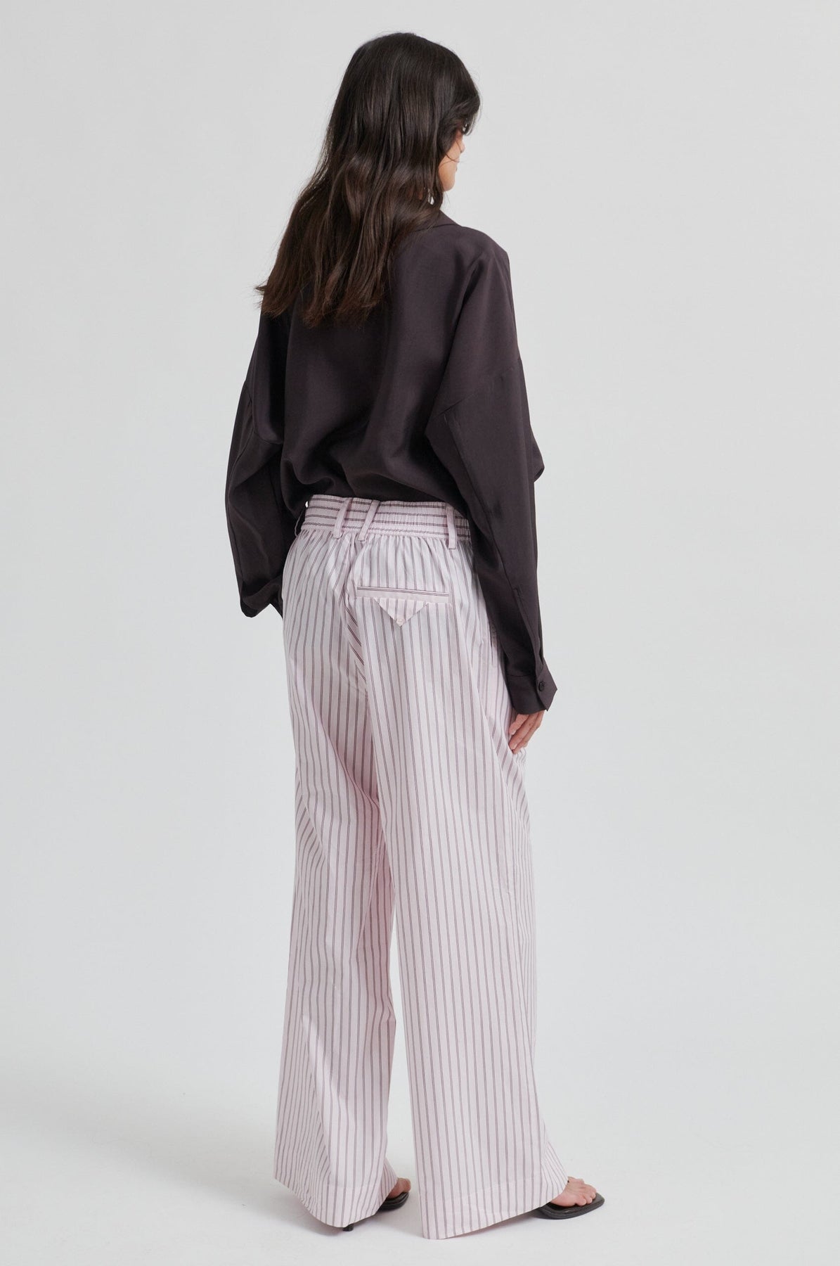 Spodnie Second Female z jasnofioletowej bawełny w pionowe paski. Spodnie mają szerokie, proste nogawki i luźny krój.