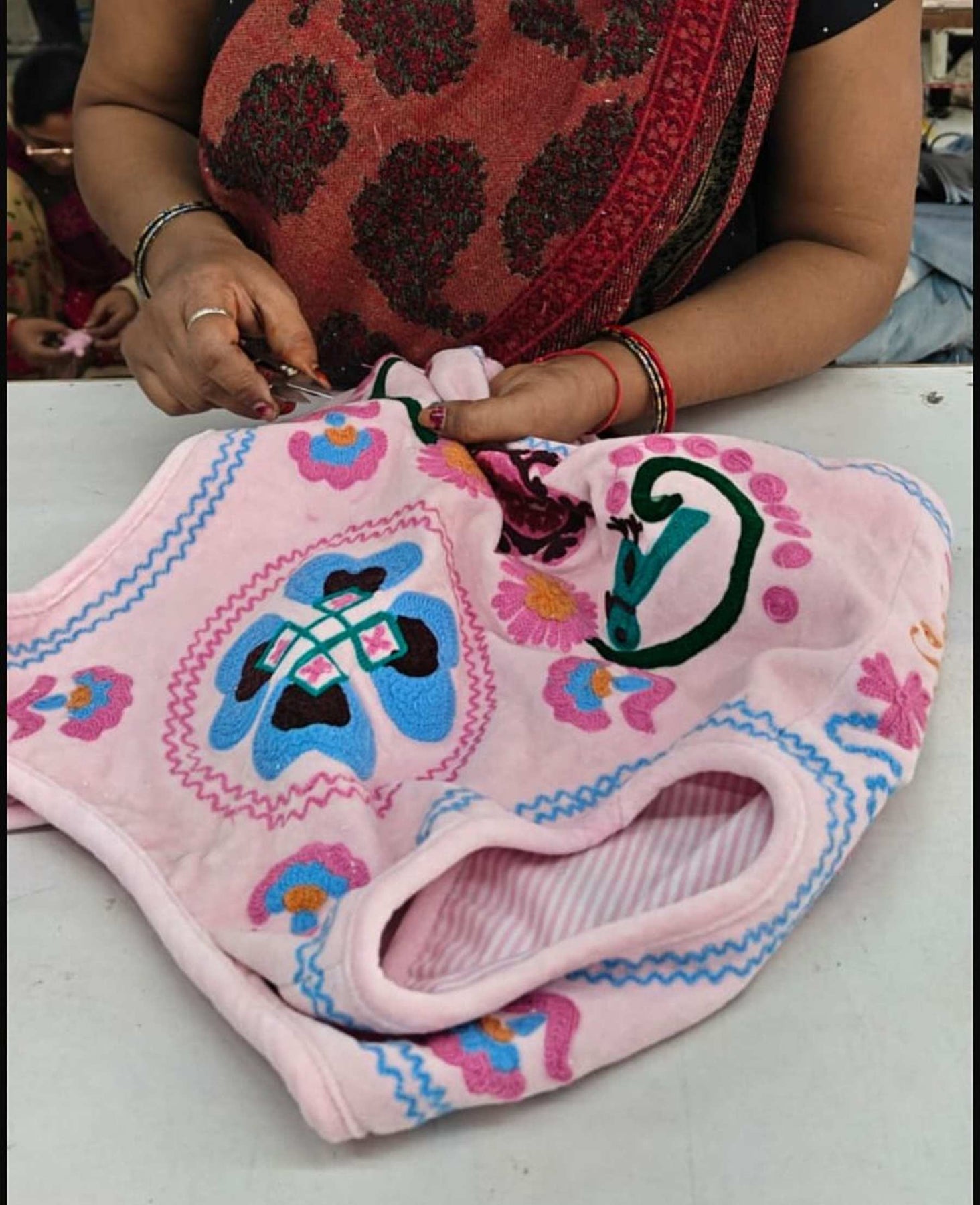 Różowa kamizelka marki Sissel Edelbo, wykonana z nadwyżek bawełny welurowej. Kamizelka jest ozdobiona haftem Suzani z motywami kwiatów i ptaków w kilku kolorach.