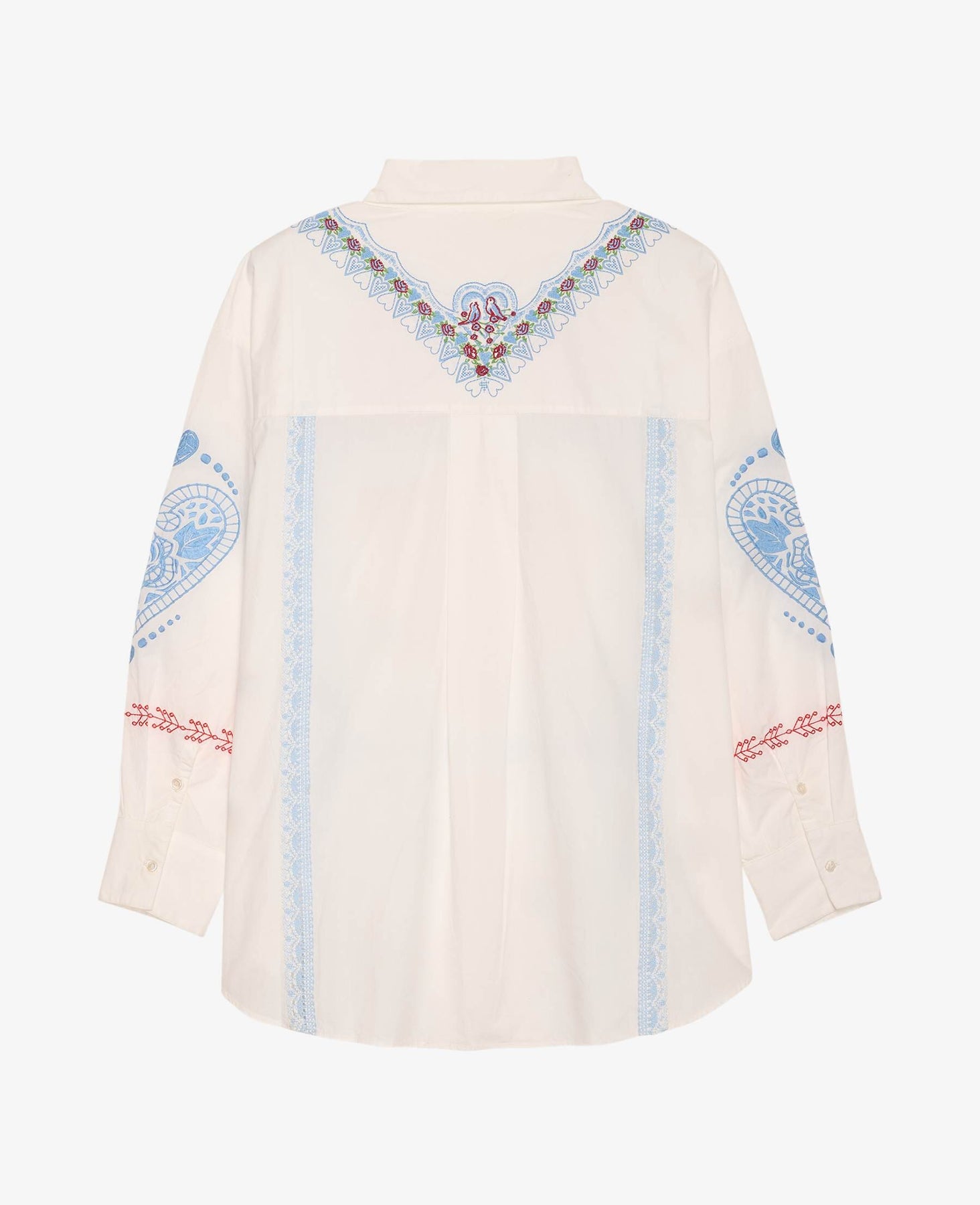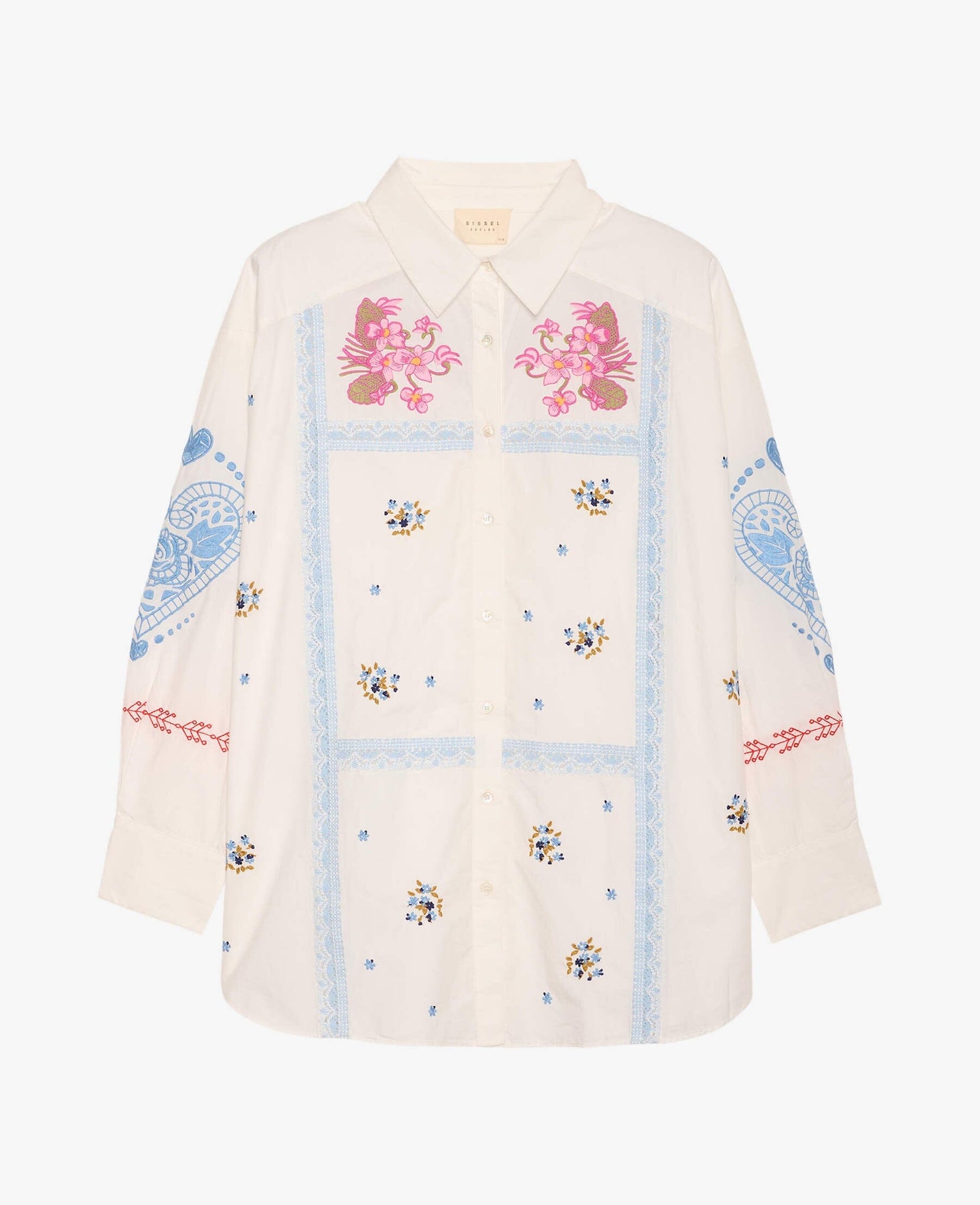 Biała koszula od Sissel Edelbo z haftowanymi kwiatami i sercami w różowych i niebieskich odcieniach oraz delikatnymi koronkami wzdłuż rękawów.
