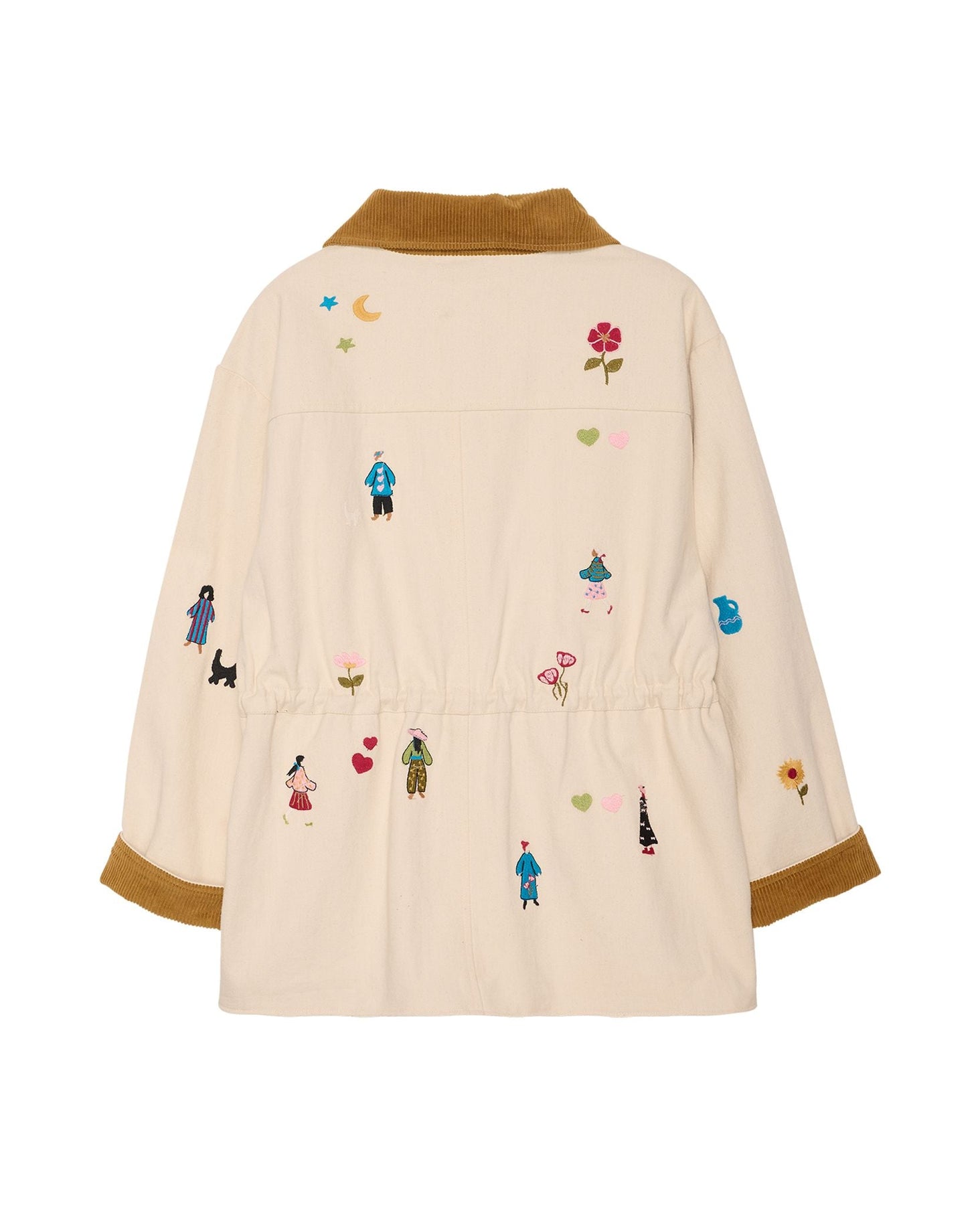 Biała kurtka marki Sissel Edelbo z haftowanymi motywami postaci, kwiatów i serc. Kurtka ma brązowy kołnierz w kontraście do reszty.
