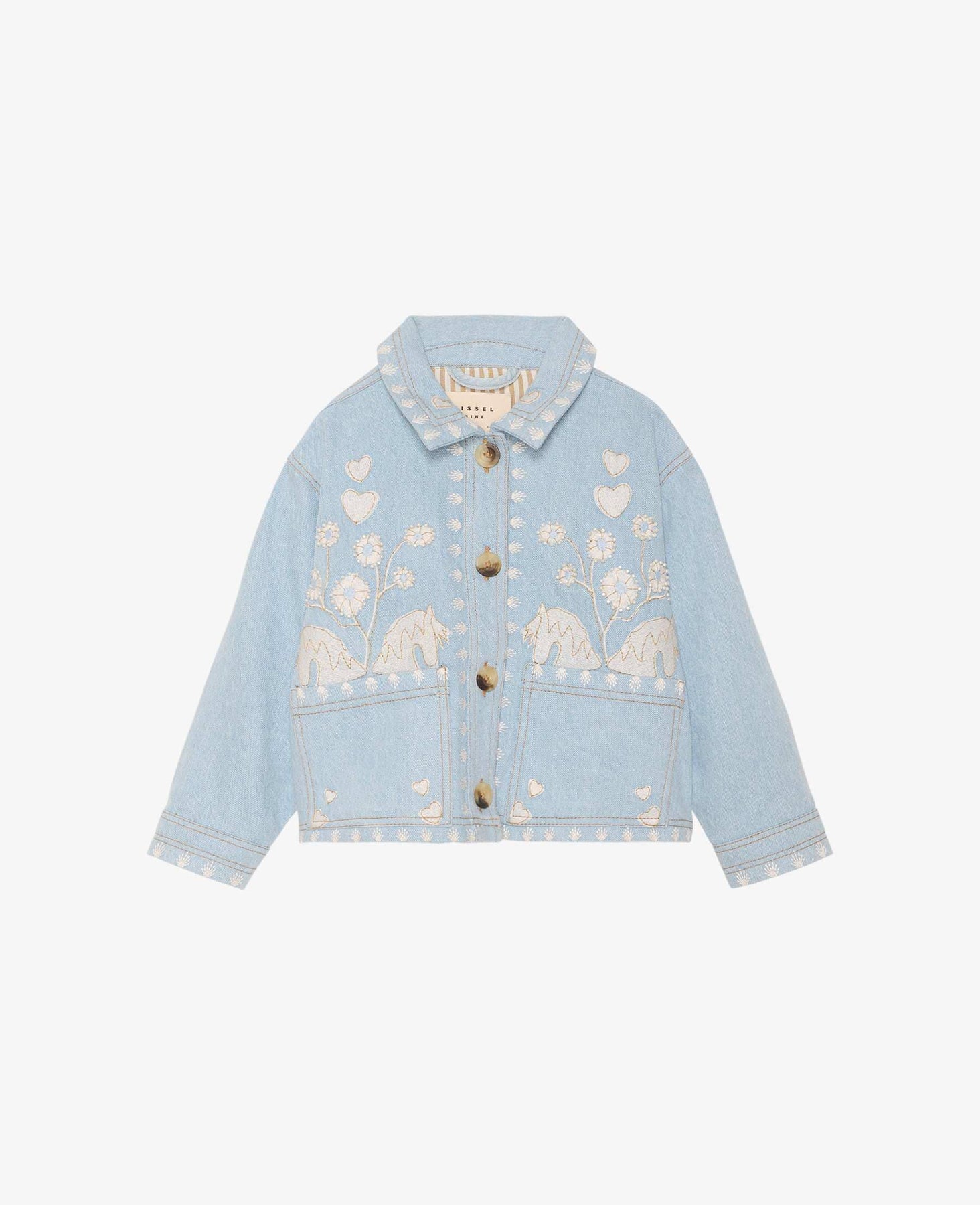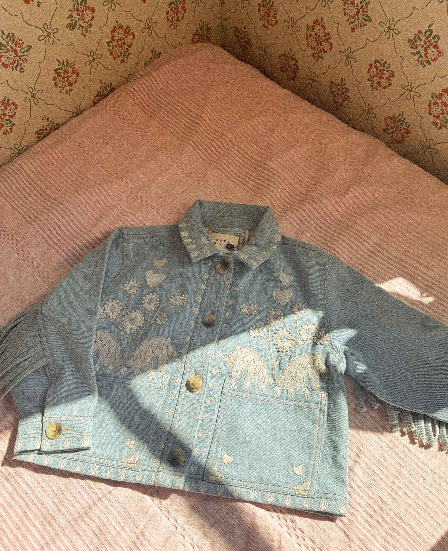 Jasnoniebieska kurtka dżinsowa od Sissel Edelbo z haftowanymi kwiatami i sercami. Kurtka ma oversize'owy krój z kołnierzykiem koszulowym i guzikami na całej długości.