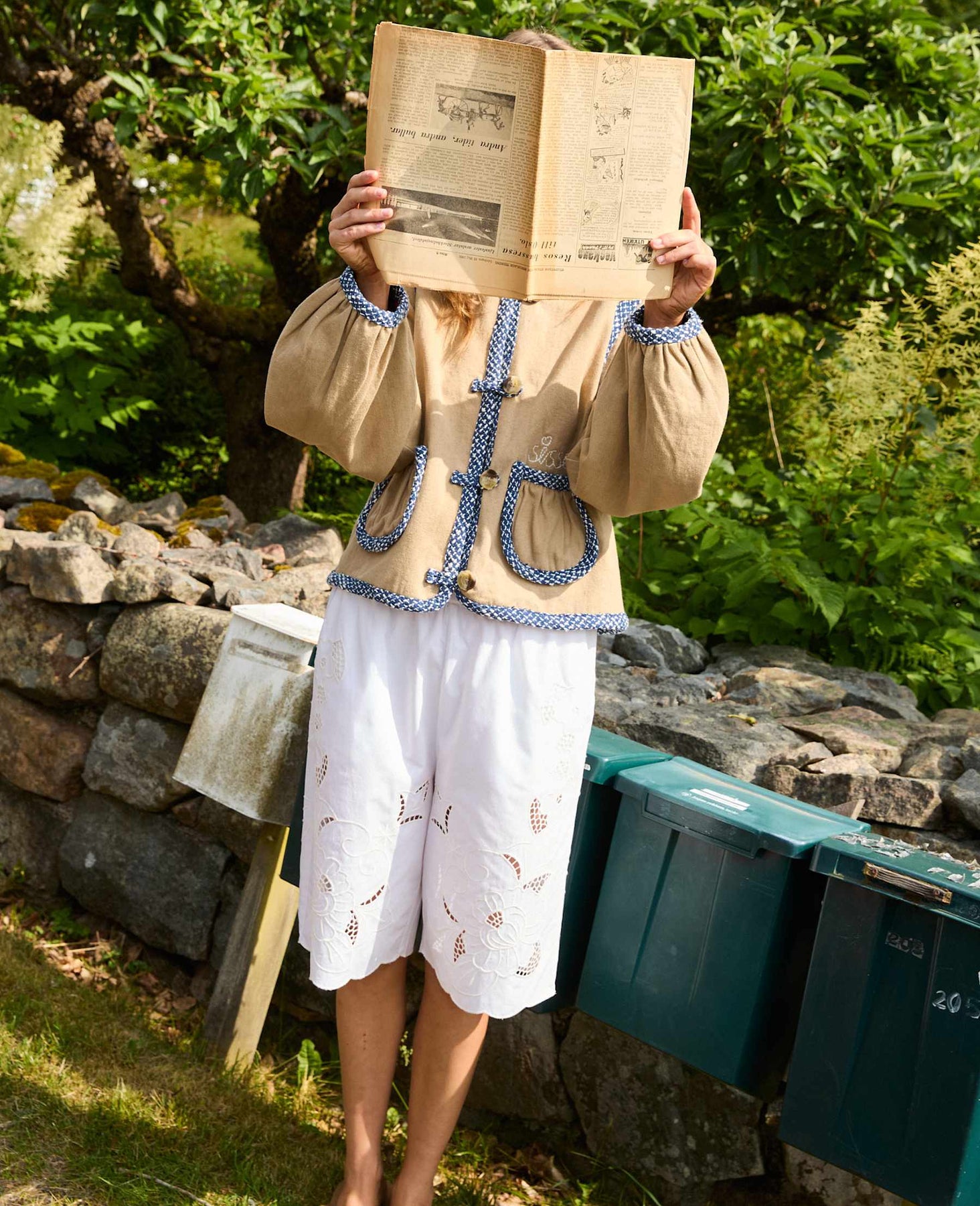Kurtka marki Sissel Edelbo z piaskowego diagonalu bawełnianego z niebieskimi wzorzystymi lamówkami z bouclé wzdłuż kołnierza, rękawów i kieszeni.