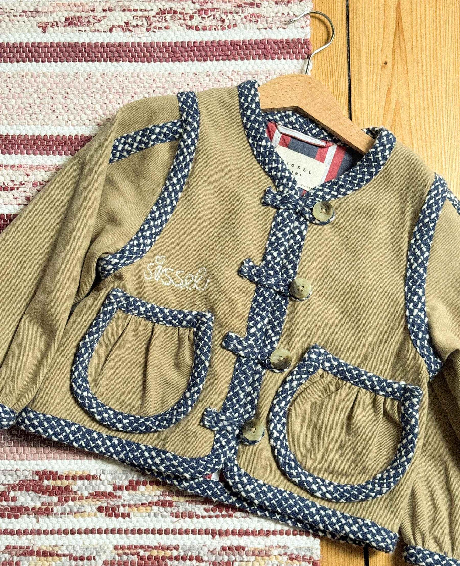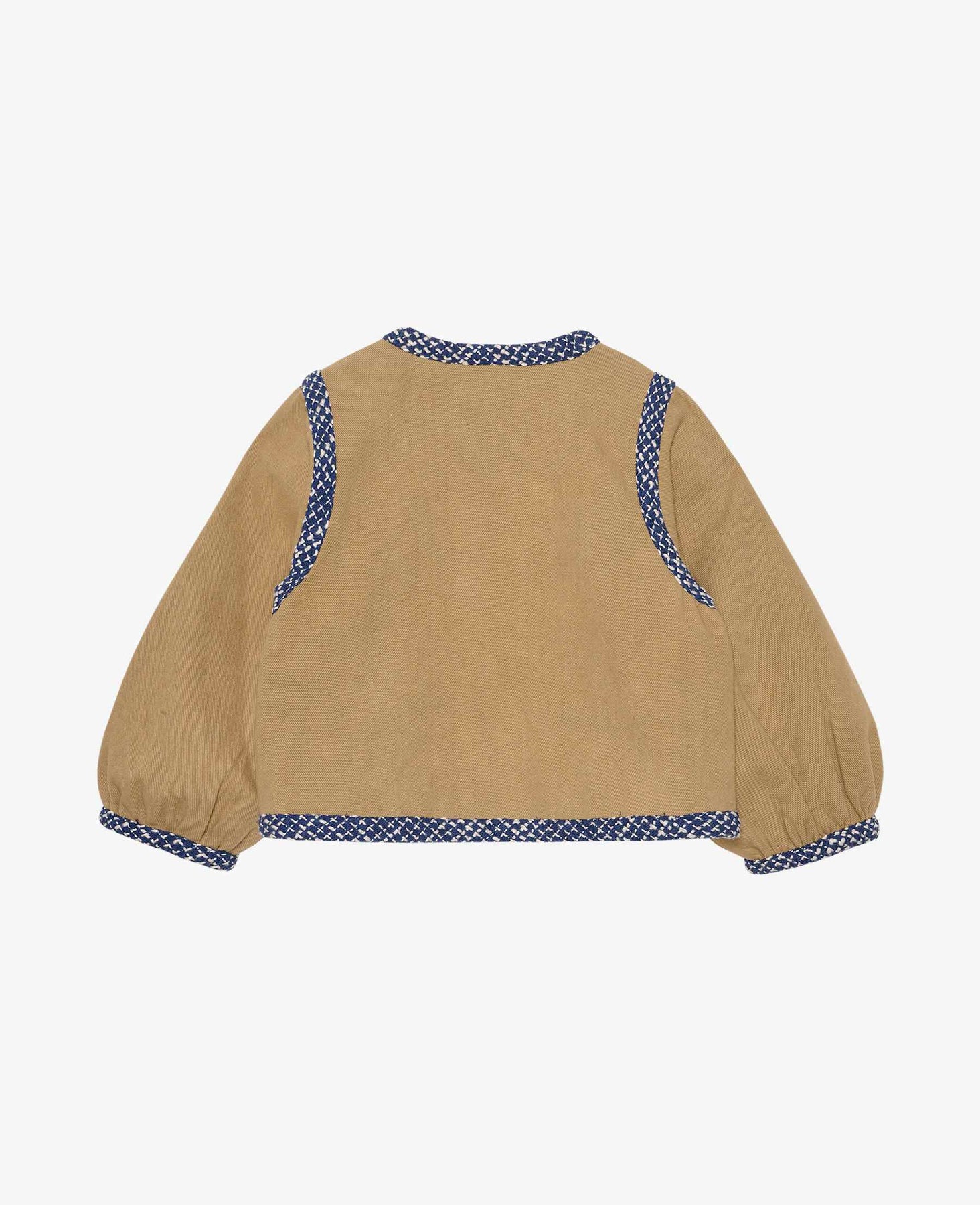Beżowa kurtka od Sissel Edelbo z niebieskimi i białymi wzorzystymi lamówkami. Kurtka ma hafty i dekoracyjne przeszycia.