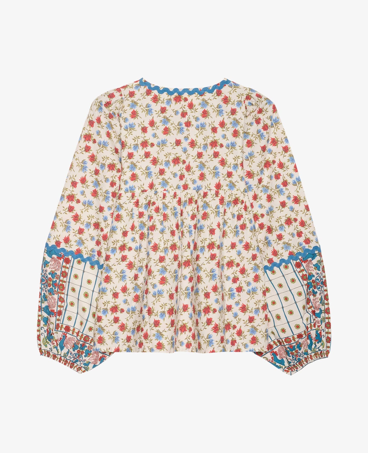 Bluzka od Sissel Edelbo z wielokolorowym kwiatowym nadrukiem w czerwonych i niebieskich odcieniach na kremowym tle. Bluzka sprawdzi się zarówno na co dzień, jak i na wyjątkowe okazje.