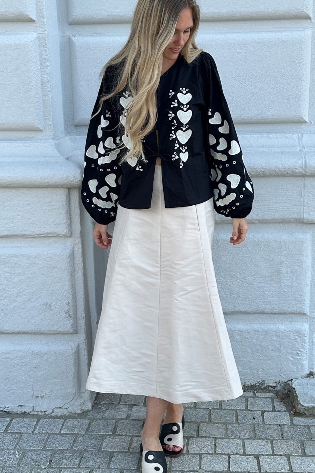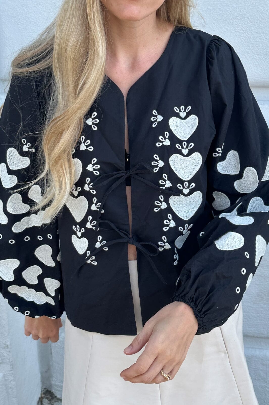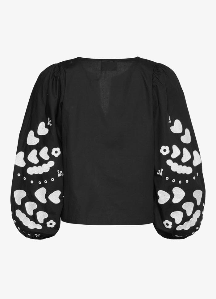 Czarny top od Sissel Edelbo z białym haftem serca z przodu i na rękawach. Top ma bufiaste rękawy z gumką na końcach rękawów i można go związać z przodu dwoma zestawami sznurków.