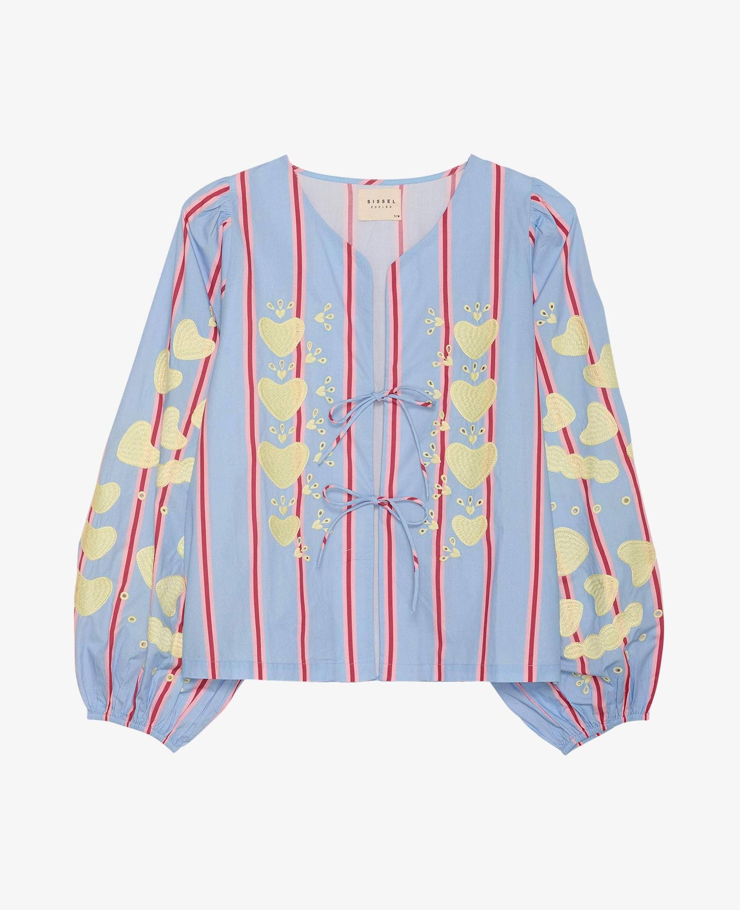 Jasnoniebieski top od Sissel Edelbo z czerwonymi paskami i zielonymi haftowanymi sercami. Top wykonany jest w 100% z ekologicznej bawełny typu popelina i ma otwarty przód.