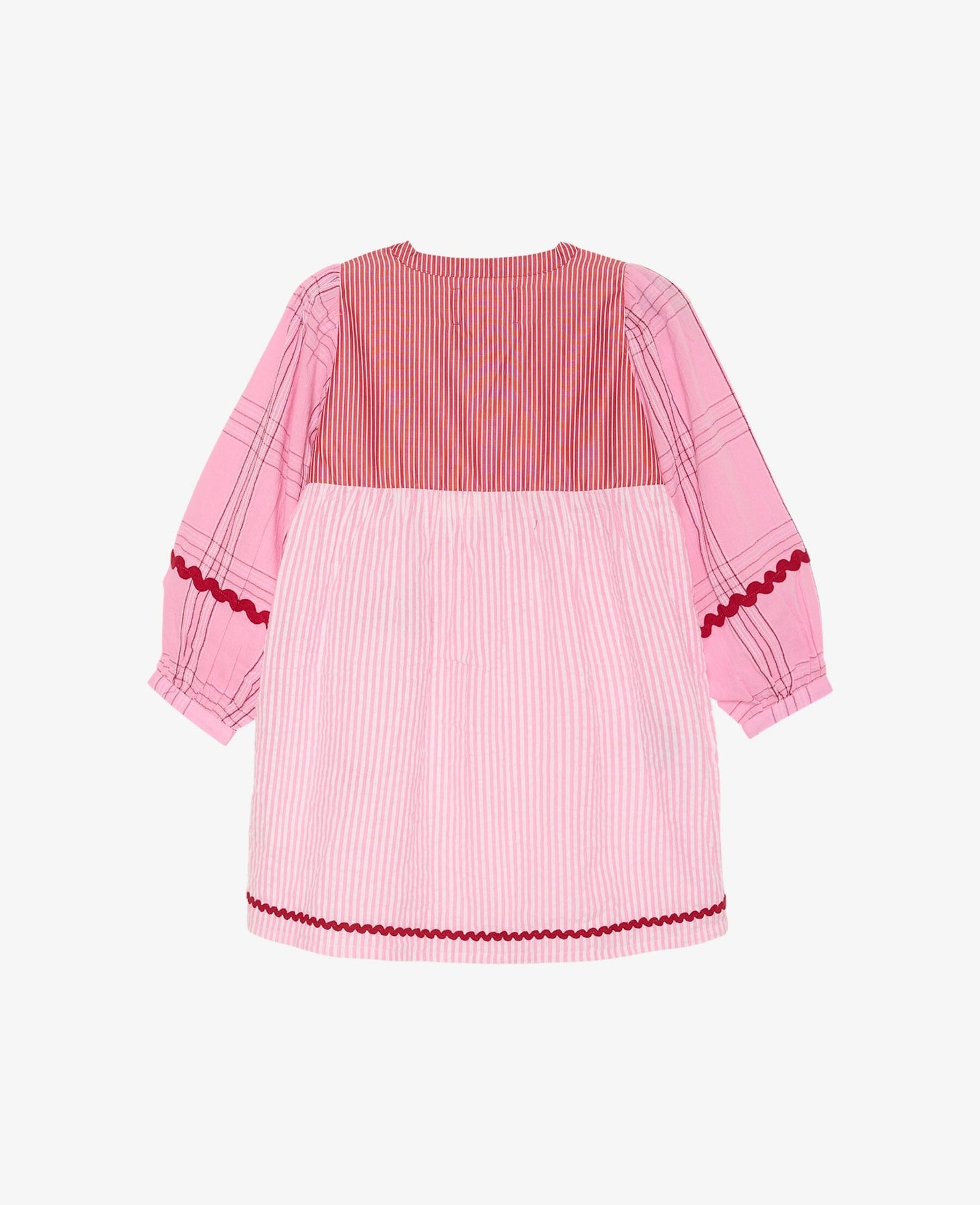 Mini sukienka od Sissel Edelbo w różowym i czerwonym w paski. Sukienka ma ręcznie robione detale, takie jak falbany, kokardy i hafty, a także długie balonowe rękawy z taśmą w zygzak.