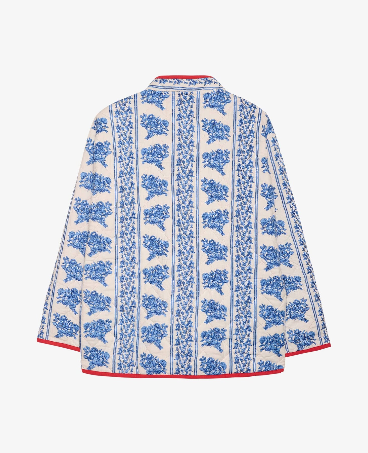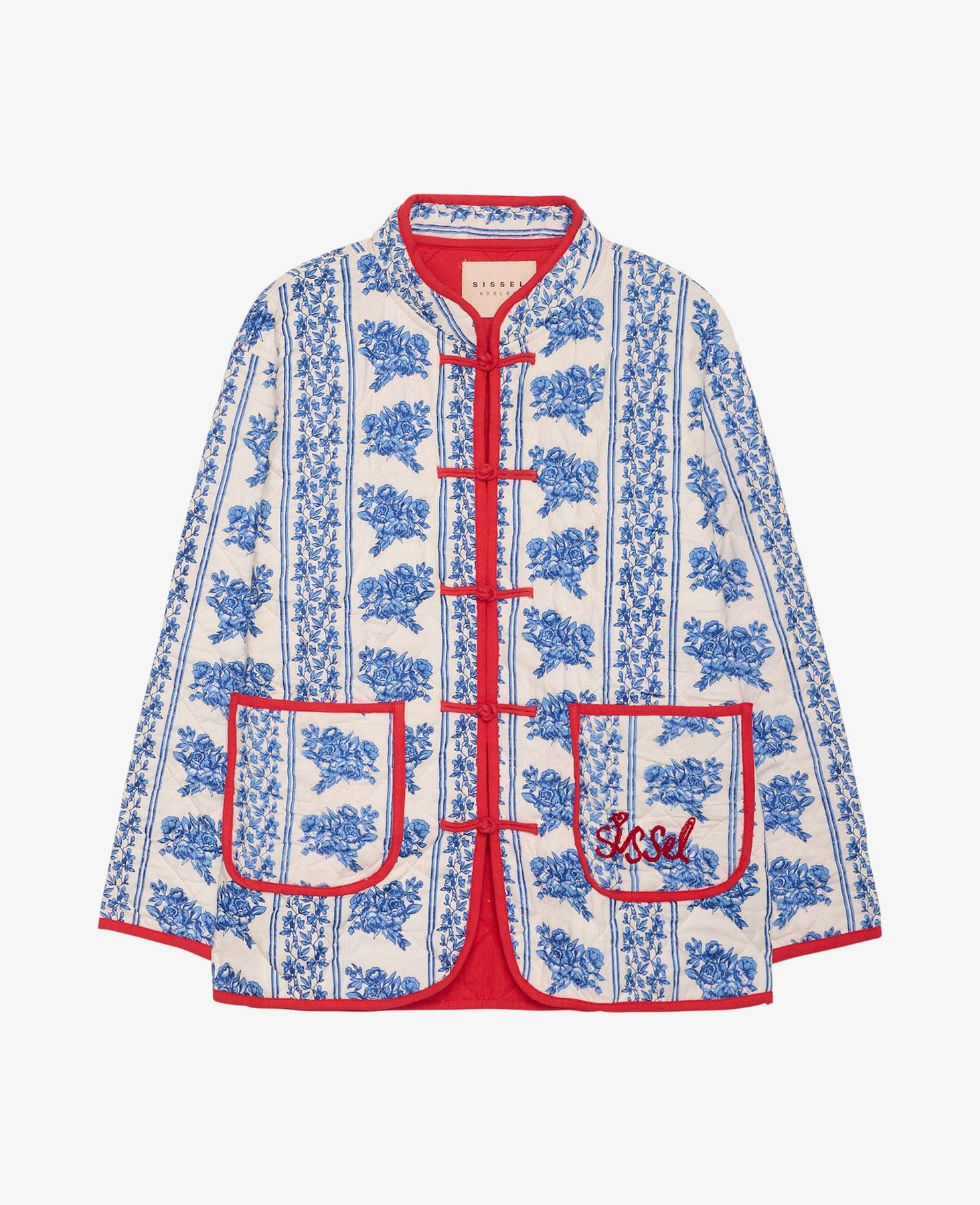 Kurtka marki Sissel Edelbo z niebieskim kwiatowym wzorem na białym tle. Kurtka ma czerwone lamówki wzdłuż przodu i przy kieszeniach.