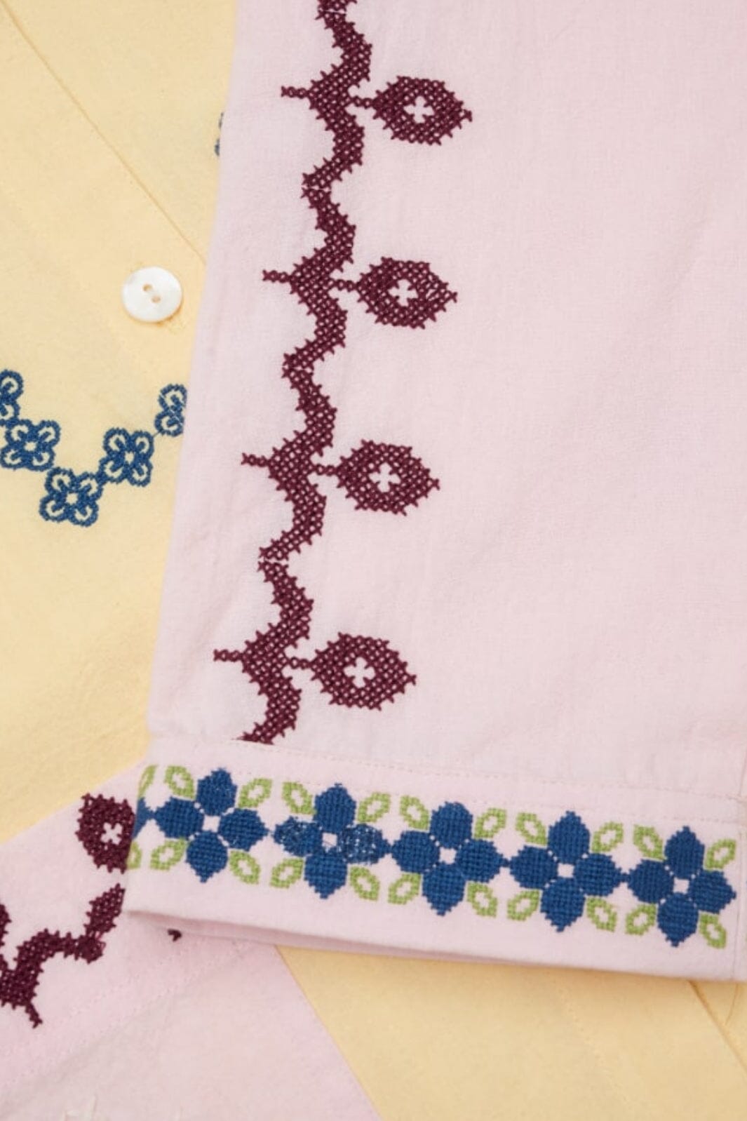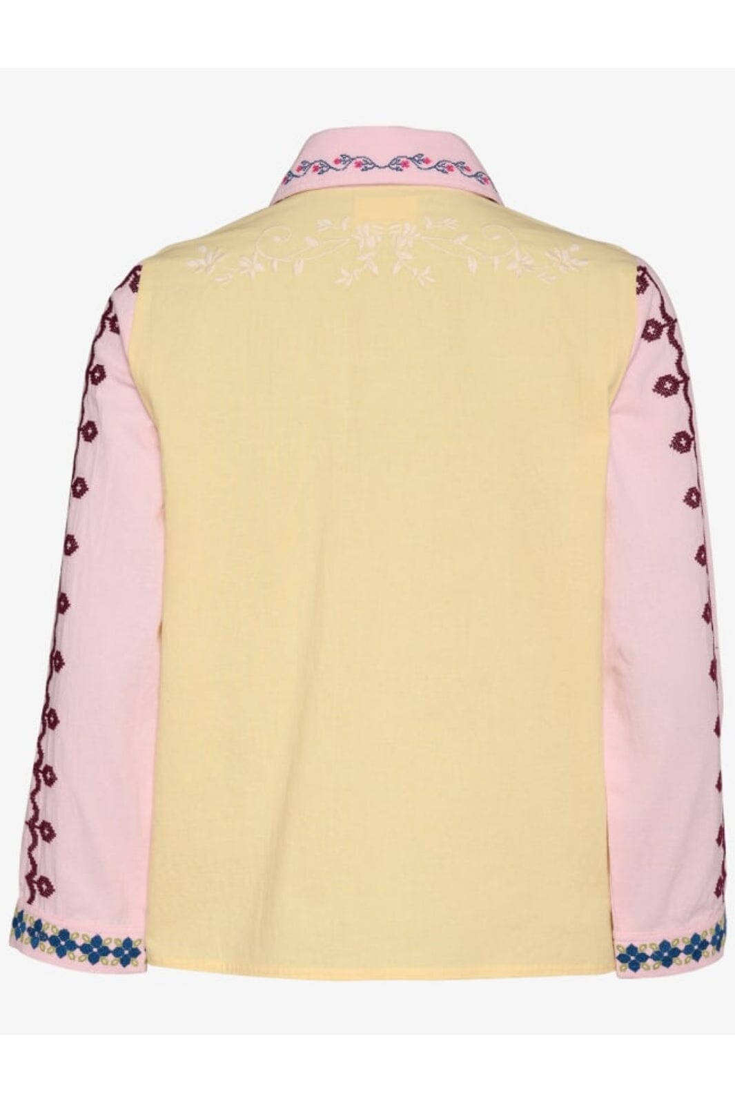 Kurtka koszulowa od Sissel Edelbo z ekologicznej bawełny. Ma luźny krój z żółtym i różowym jako kolorami podstawowymi, dekoracyjnymi haftami krzyżykowymi i małym kołnierzykiem.