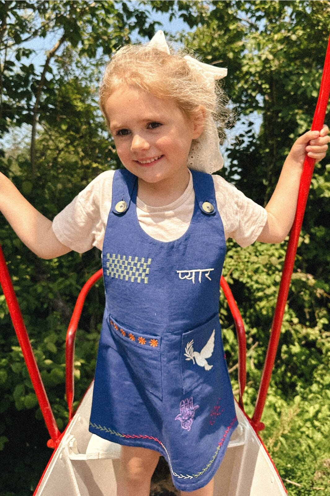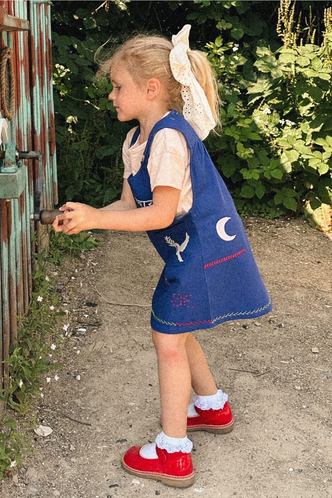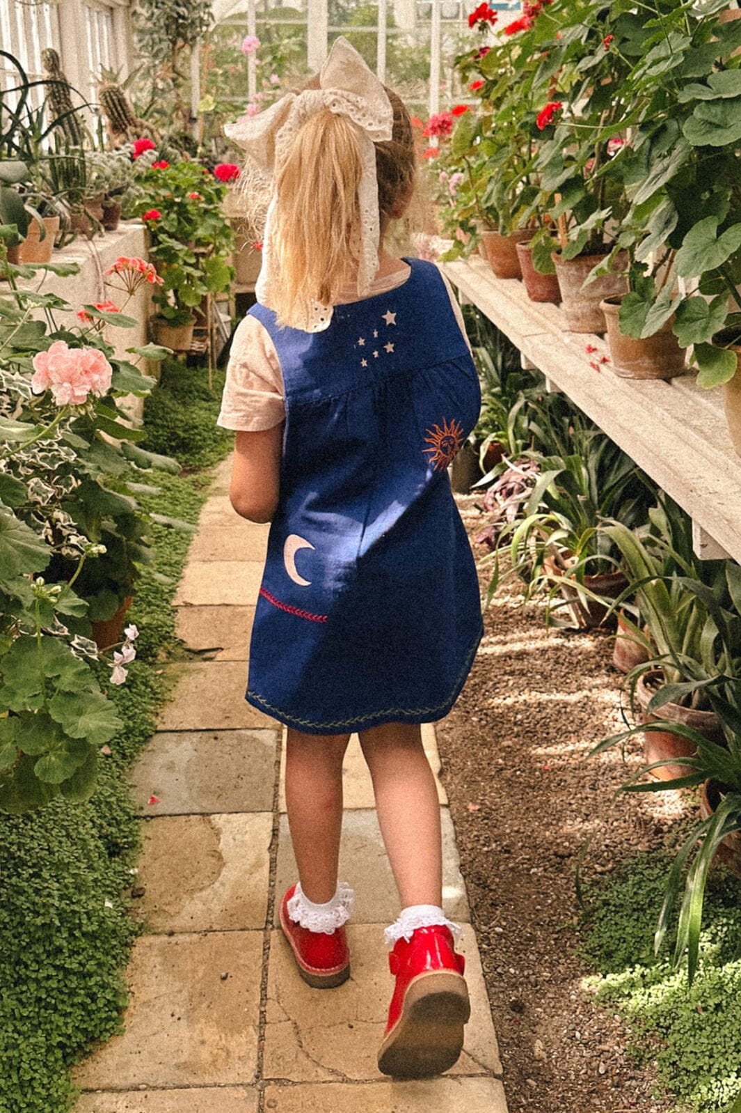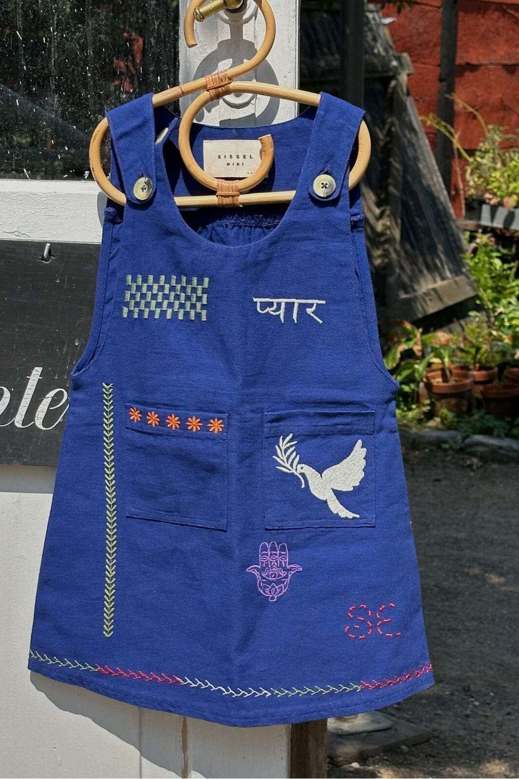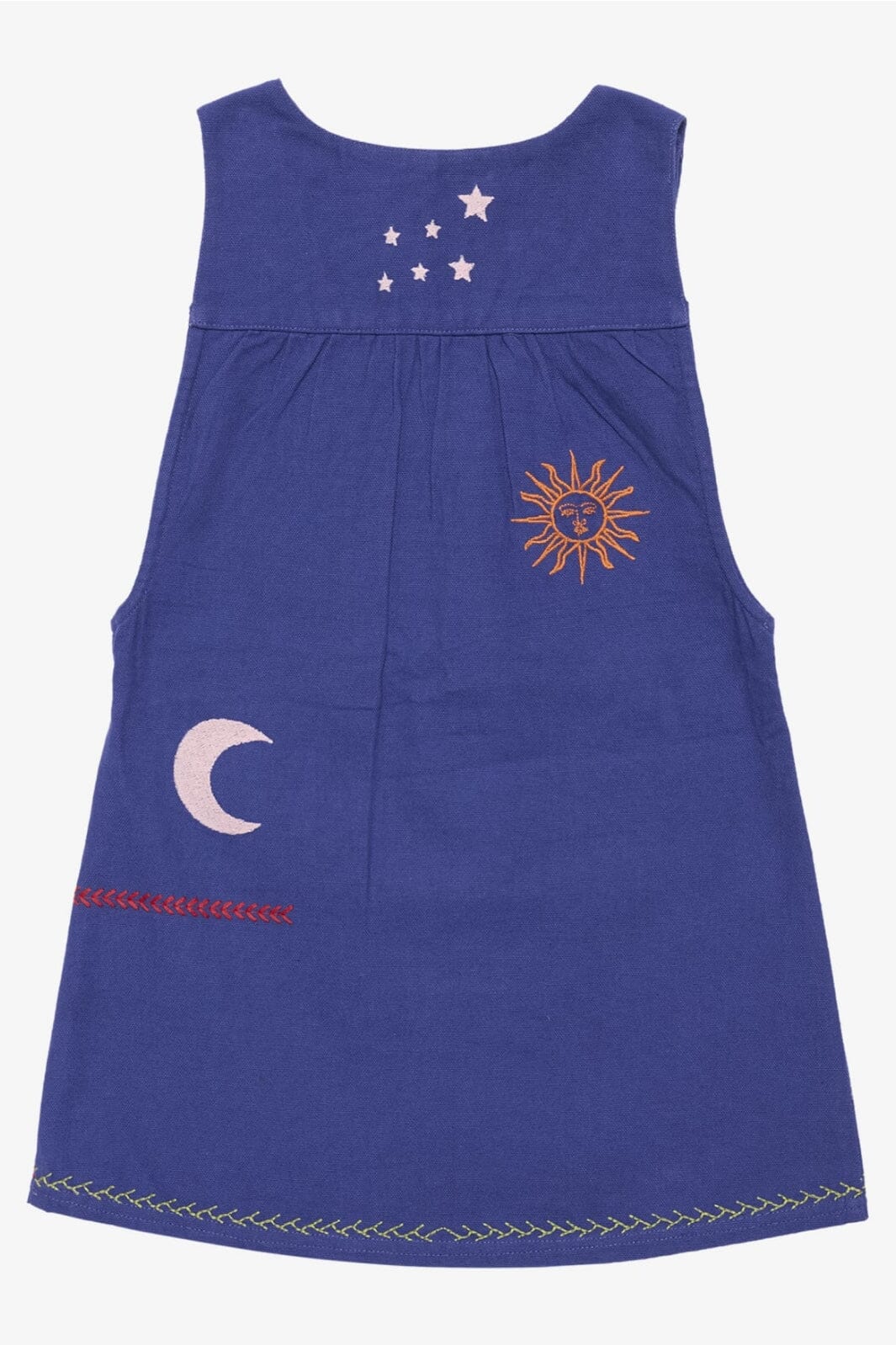 Sukienka od Sissel Edelbo w ultramarynowym organicznym bawełnianym płótnie. Sukienka bez rękawów ma haftowane motywy z ptakami, kwiatami i gwiazdami oraz praktyczne kieszenie z przodu.